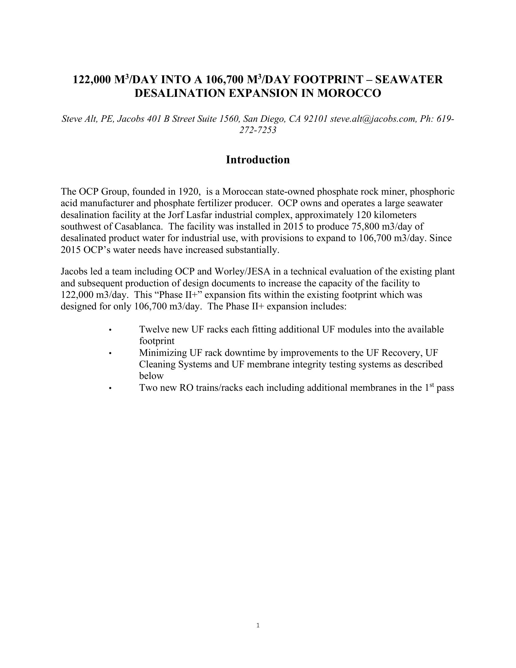 The OCP Group, founded in 1920, is a Moroccan state-owned phosphate rock miner, phosphoric acid manufacturer and phosphate fertilizer producer. OCP owns and operates a large seawater desalination facility at the Jorf Lasfar industrial complex, approximately 120 kilometers southwest of Casablanca. The facility was installed in 2015 to produce 75,800 m3/day of desalinated product water for industrial use, with provisions to expand to 106,700 m3/day. Since 2015 OCPís water needs have increased substantially. Jacobs led a team including OCP and Worley/JESA in a technical evaluation of the existing plant and subsequent production of design documents to increase the capacity of the facility to 122,000 m3/day. This ìPhase II+î expansion fits within the existing footprint which was designed for only 106,700 m3/day. The Phase II+ expansion includes: ï Twelve new UF racks each fitting additional UF modules into the available footprint ï Minimizing UF rack downtime by improvements to the UF Recovery, UF Cleaning Systems and UF membrane integrity testing systems as described below ï Two new RO trains/racks each including additional membranes in the 1st pass