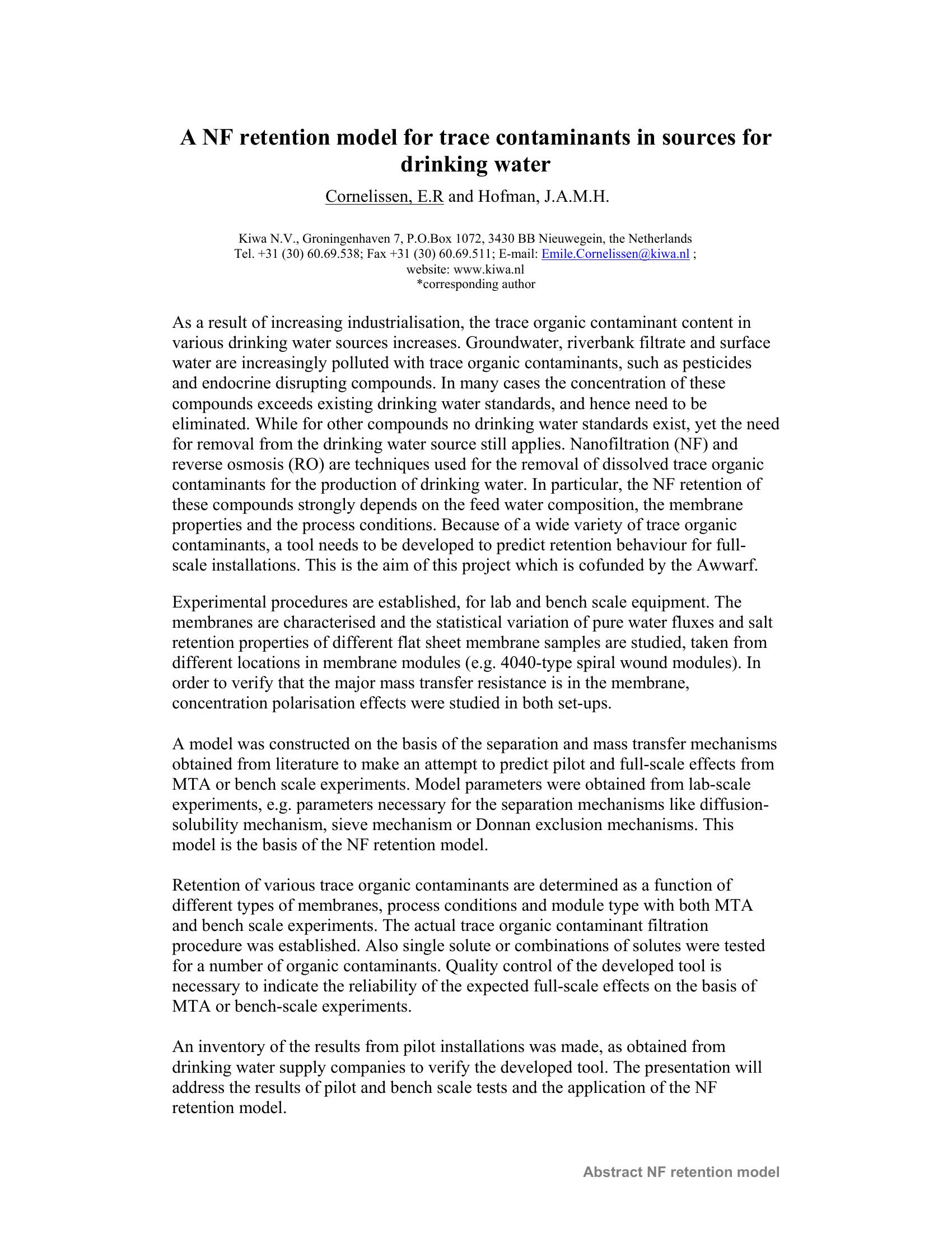 The presentation will address the results of pilot and bench scale tests and the application of a Nanofiltration retention model for trace organic compounds. .
