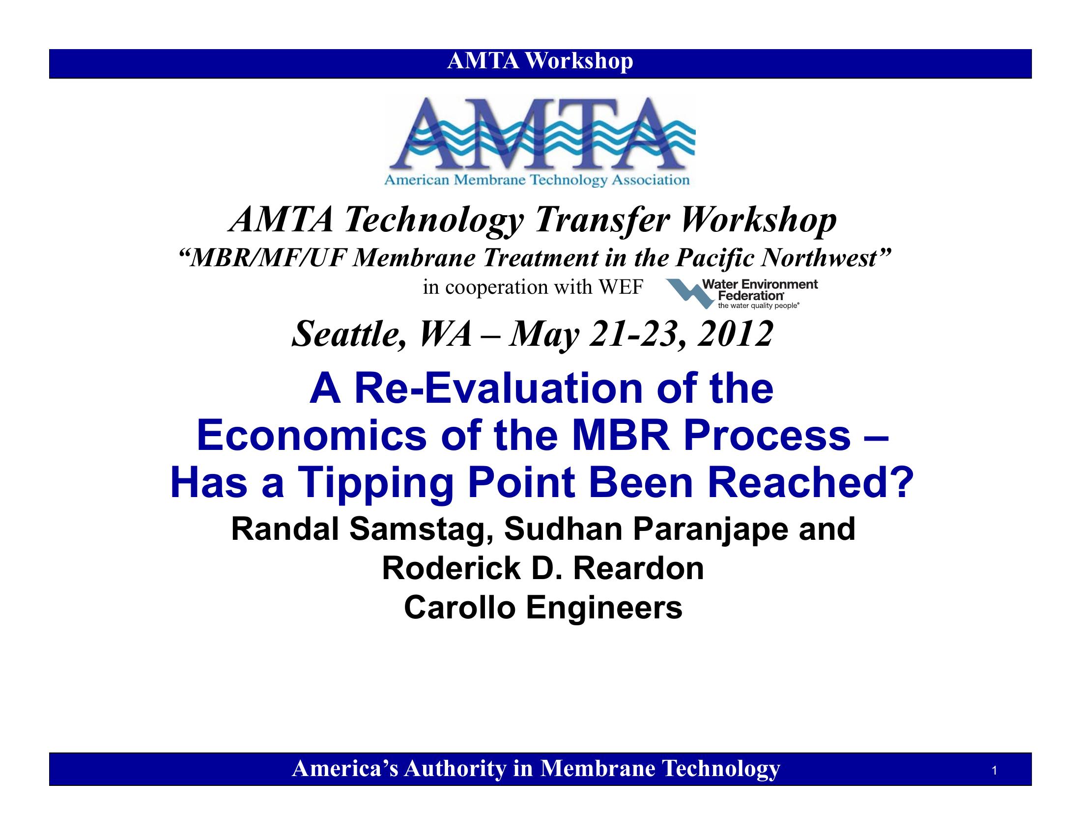 A RE-Evaluation of the Economics of the MBR Process – Has a Tipping Point Been Reached?