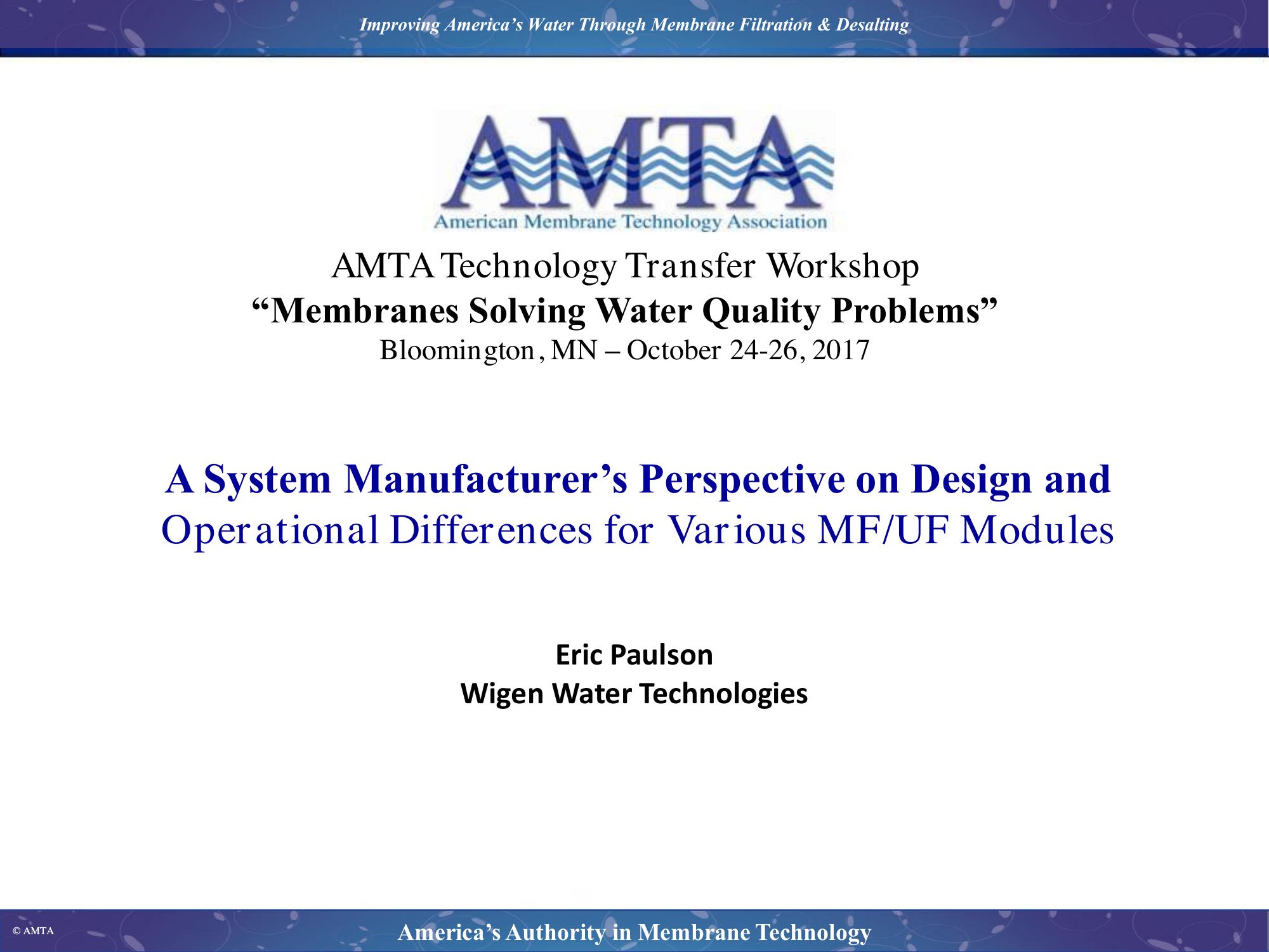 In the past 8-10 years, MF and UF modules have become available to system integrators from membrane manufacturers who only sell modules, much the same sales process as for the RO elements. This is a new business model compared to previously when the system integrators had their own proprietary MF/UF membranes. This non-proprietary model has resulted in system integrators gaining experience building systems with modules from a number of different suppliers. These MF/UF systems are designed for either one type of module or more recently as open platform systems designed to use modules from several suppliers. This presentation will describe the design differences for modules from a range of MF/UF suppliers, including some full-scale case studies, and how these differences can be incorporated into open platform/universal MF/UF systems.