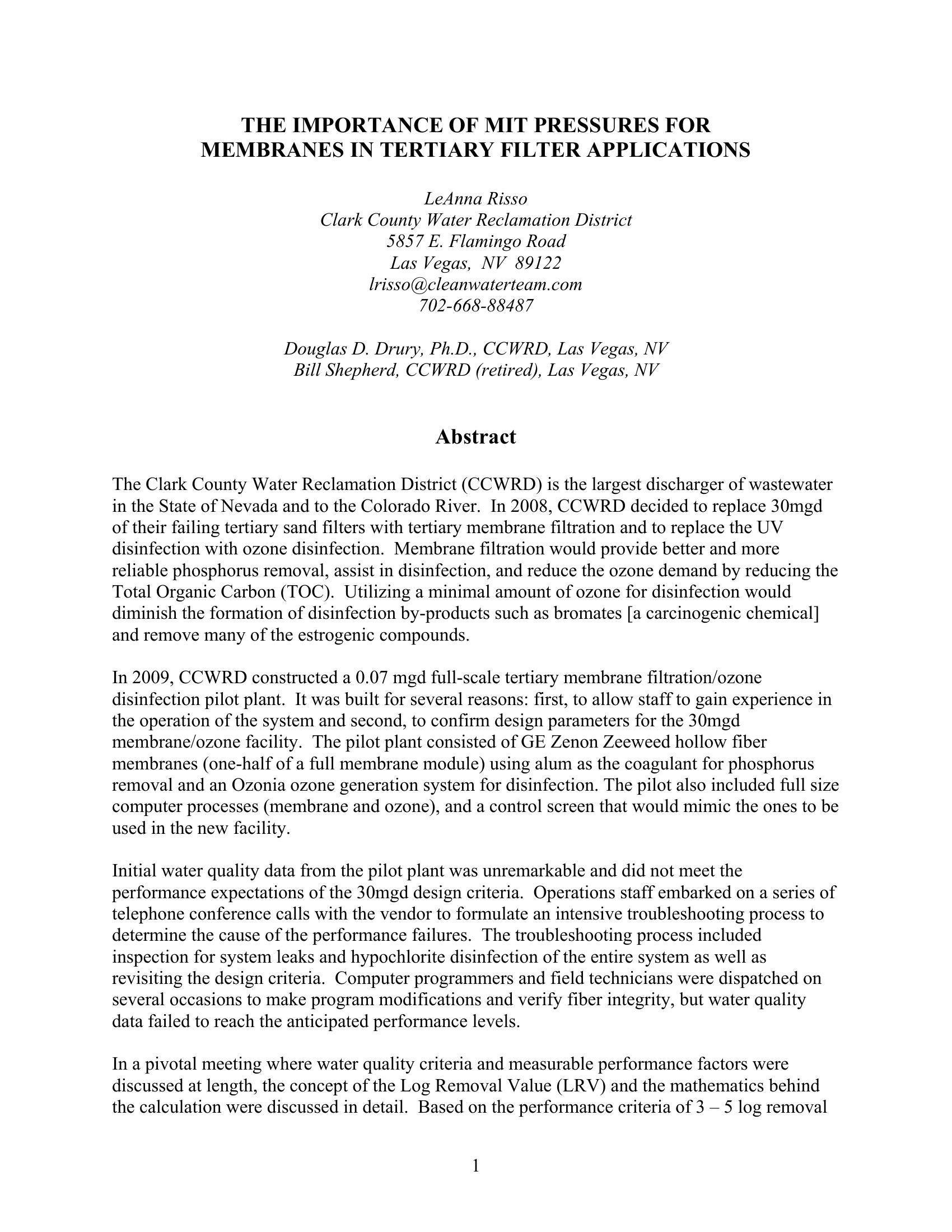 | Keywords | UF MIT testing, Direct Sand Filtration, Phosphate & TOC removal with UF |