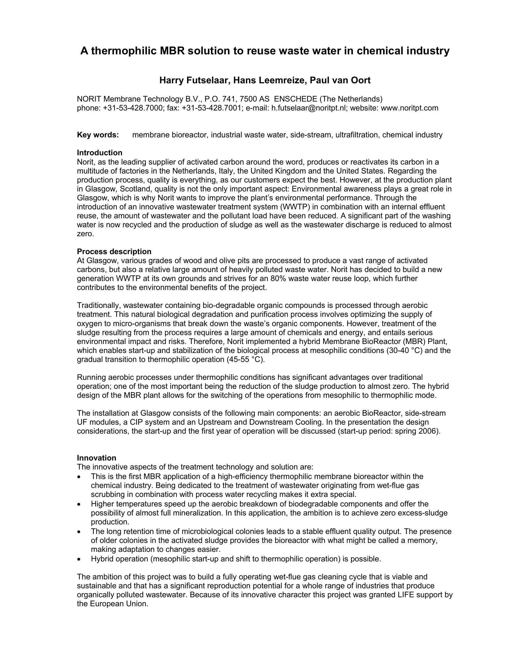 | Keywords | thermophilic MBR, membrane bioreactor, industrial waste water, side-stream, ultrafiltration, chemical industry, Glasgow Scotland |