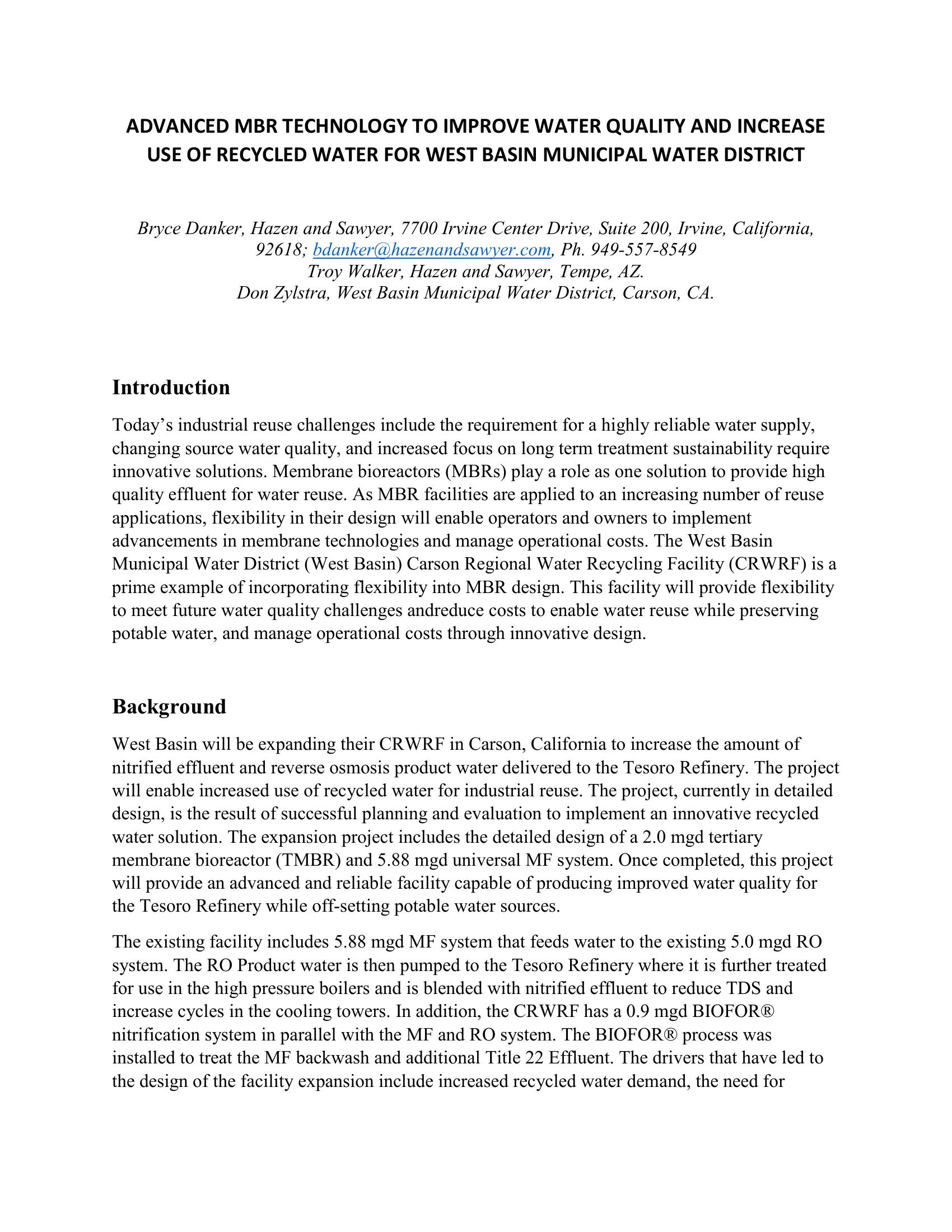 Advanced MBR Technology to Improve Water Quality and Increase Use of Recycled Water for West Basin Municipal Water District