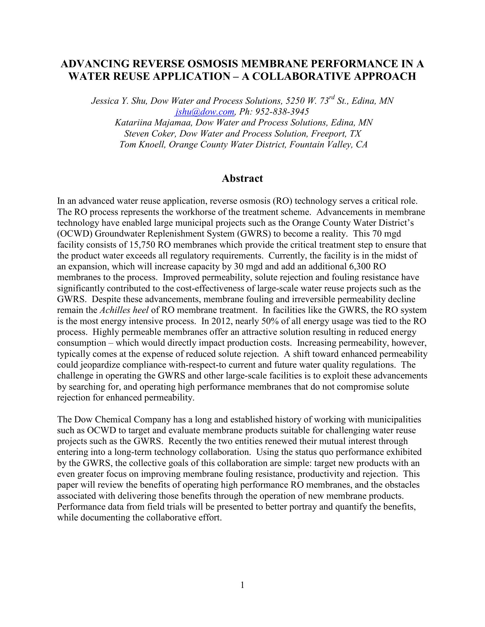Advancing Reverse Osmosis Membrane Performance in a Water Reuse Application – A Collaborative Approach