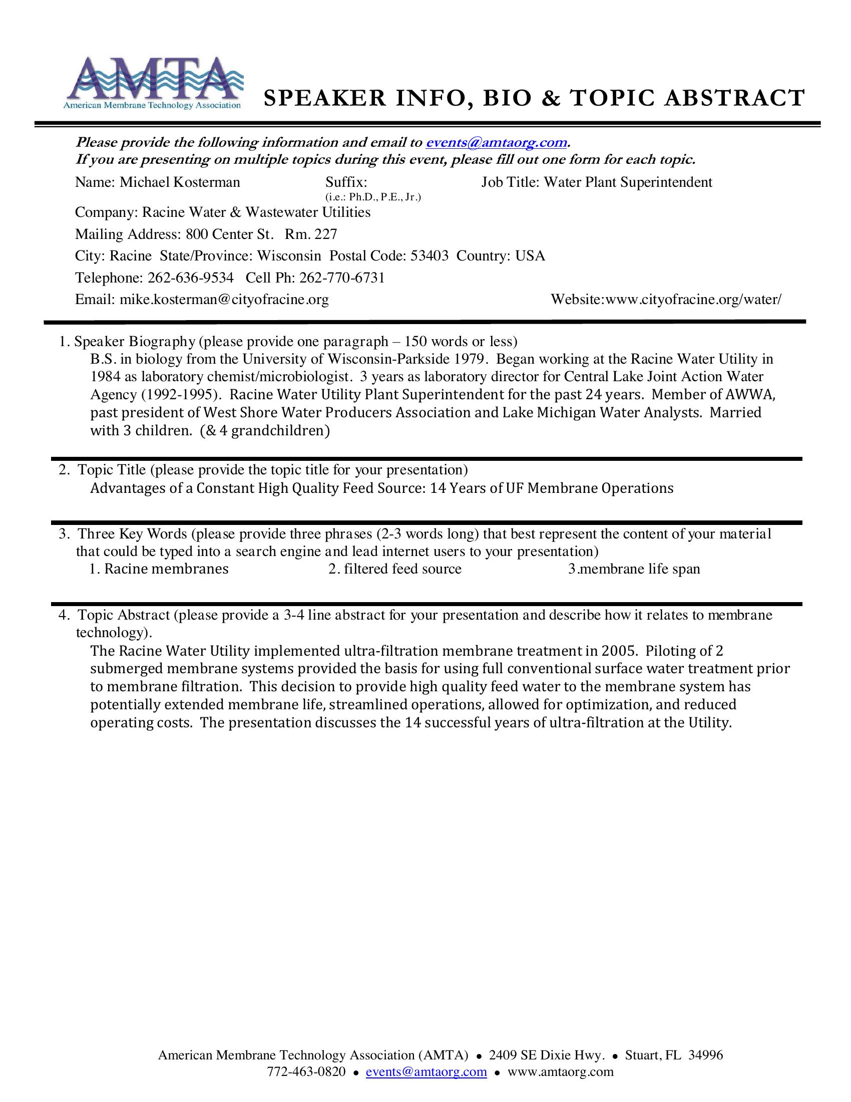 | Keywords | Racine Membranes, Filtered Feed Source, Membrane Life Span |