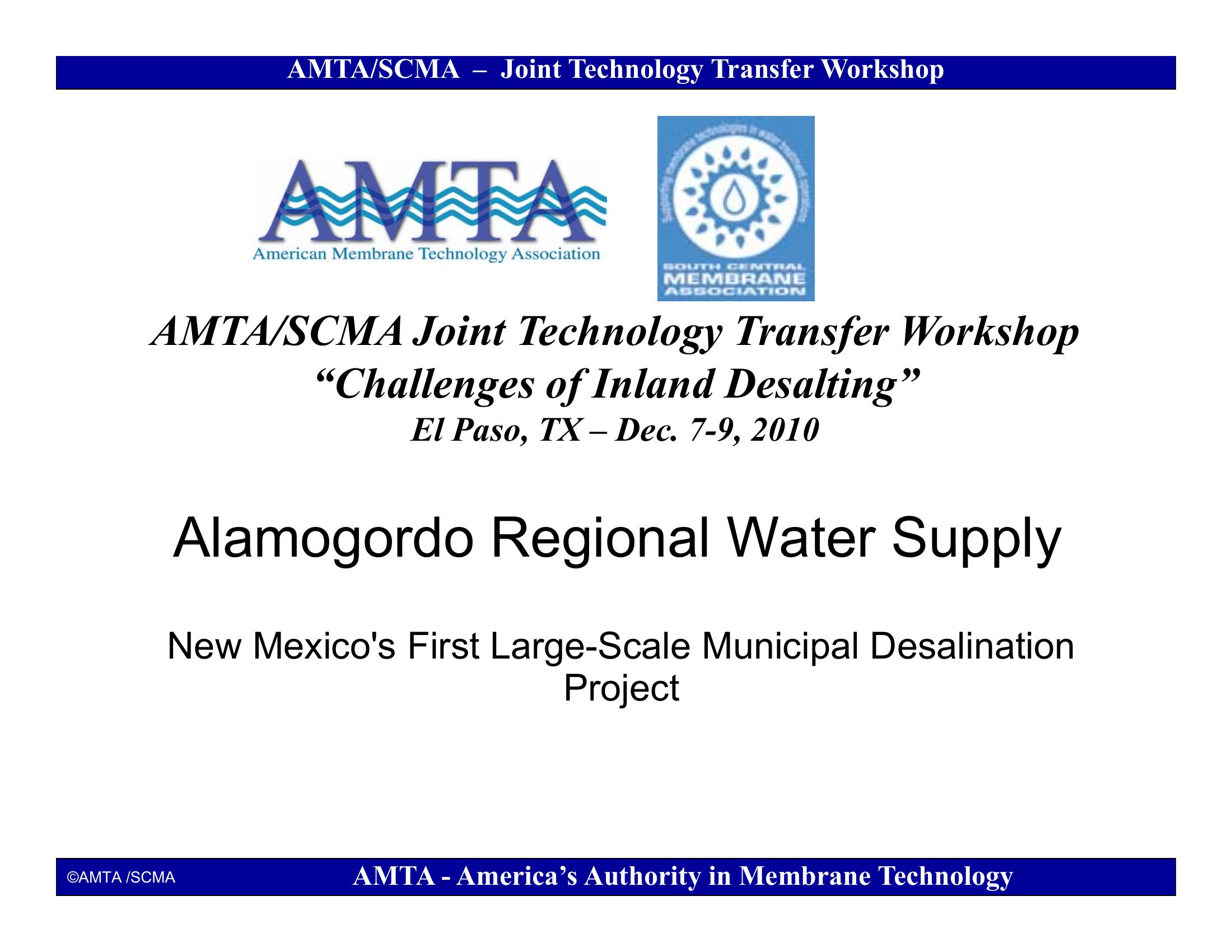 Alamogordo Regional Water Supply, New Mexico’s first large scale municipal desalination project located in the Tularosa Basin at the foot of the Sacramento Mountains. The reverse osmosis plant will operate at 80% recovery producing 2.8 MGD and act as a ?peaking? facility. The concentrate is expected to be around 8,400 mg/l TDS disposed of through deep well injection.