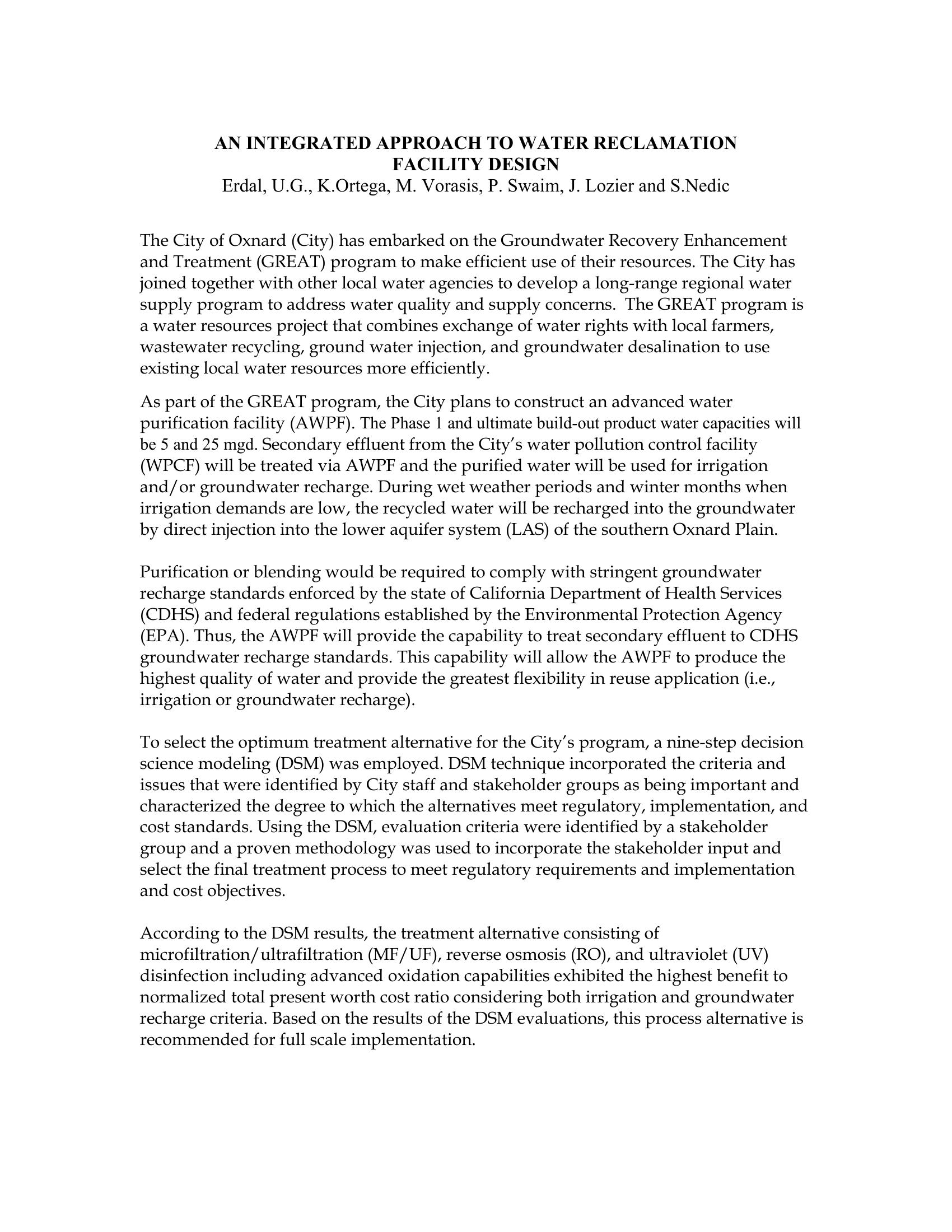 Discusses a decision model to determine the best treatment process for the City of Oxnard, CA’s groundwater recharge process utilizing secondary effluent.