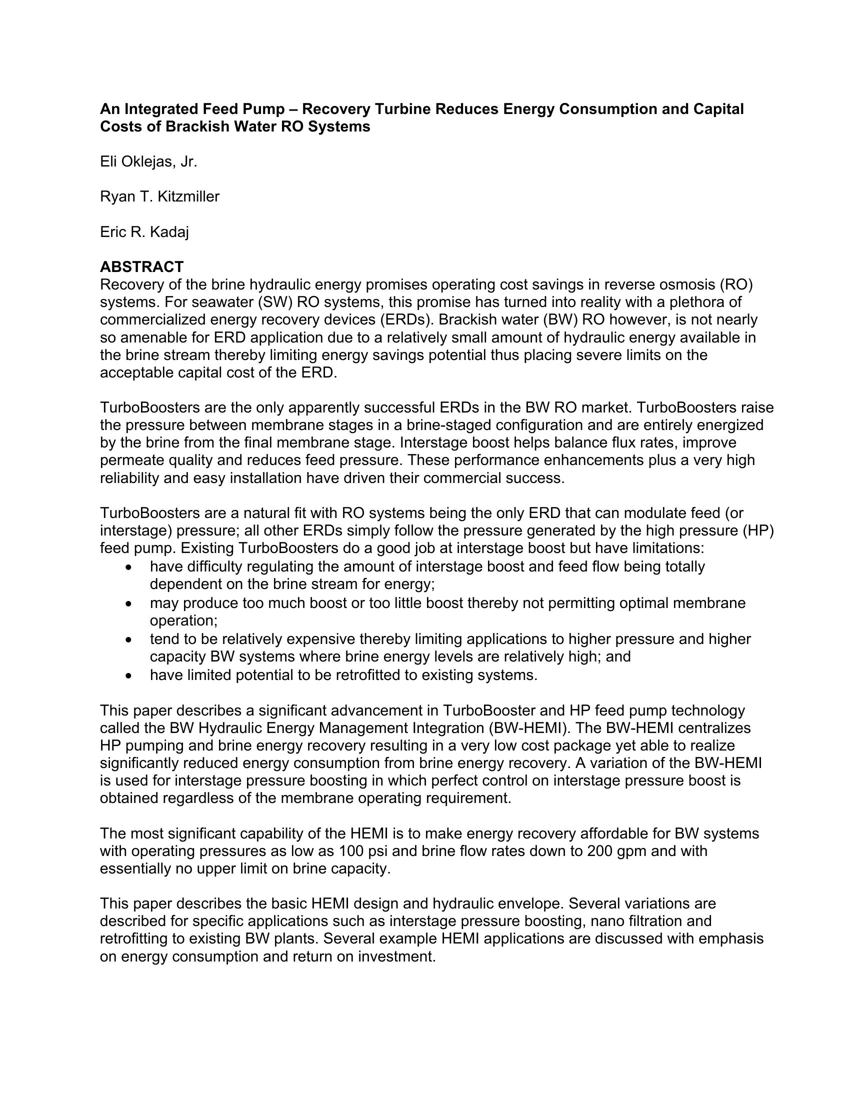 | Keywords | BW Hydraulic Energy Management Integration (BW-HEMI), energy recovery, interstage pressure boost, seawater RO, brackish water (BW) RO, Low Pressure Hydraulic Energy Management Integration (LPHEMI?) |