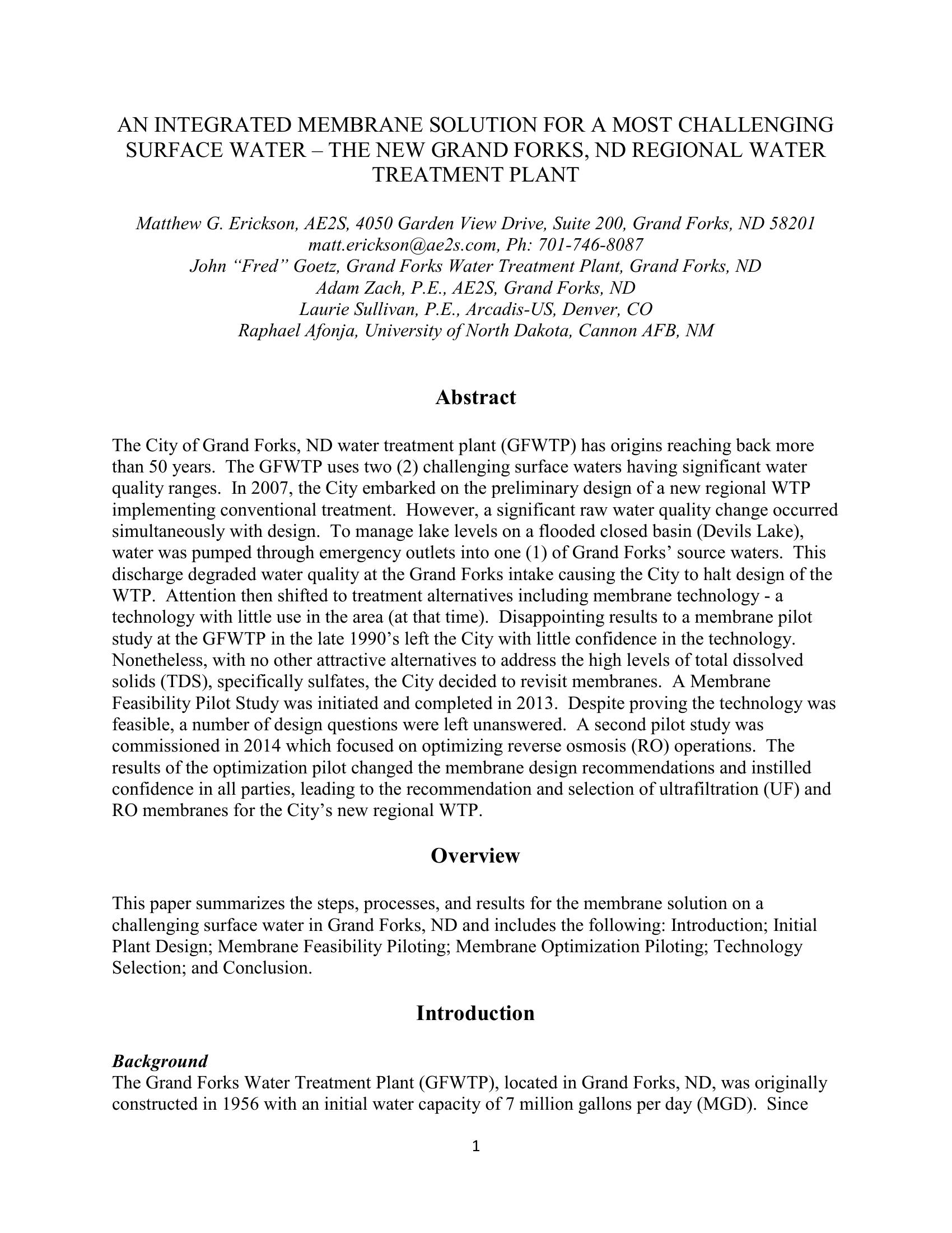 This paper summarizes the steps, processes, and results for the membrane solution on a challenging surface water in Grand Forks, ND and includes the following: Introduction; Initial Plant Design; Membrane Feasibility Piloting; Membrane Optimization Piloting; Technology Selection; and Conclusion.
