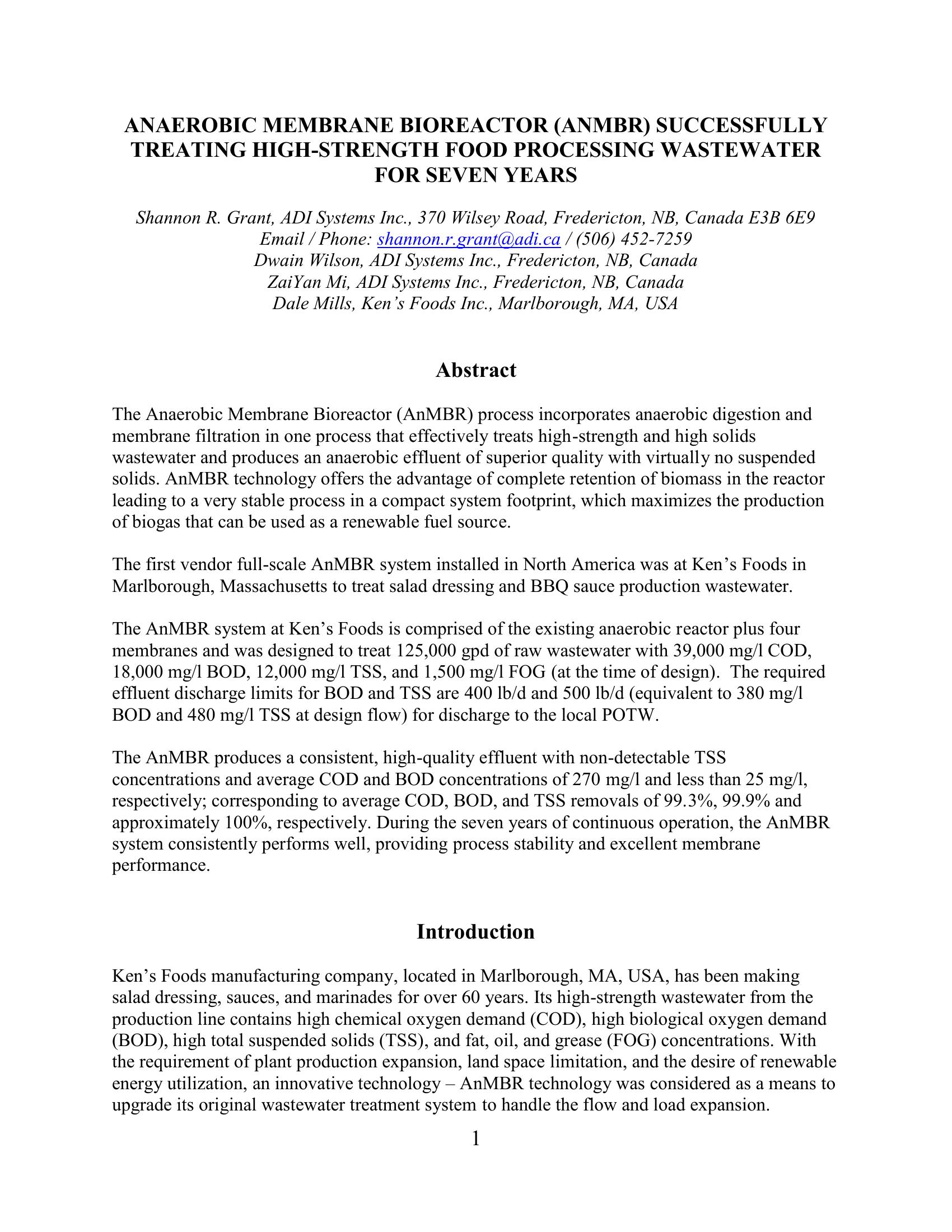 The paper discusses the first full-scale vendor supplied Anaerobic Membrane Bioreactor AnMBR) system in North American at Ken?s Foods plant Foods in Marlborough, Massachusetts that has been treating salad dressing and BBQ sauce wastewater successfully for seven years since being commissioned in July 2008. The (AnMBR) process incorporates anaerobic digestion and membrane filtration in one process that effectively treats high-strength and high solids wastewater and produces an anaerobic effluent of superior quality with virtually no suspended solids.
