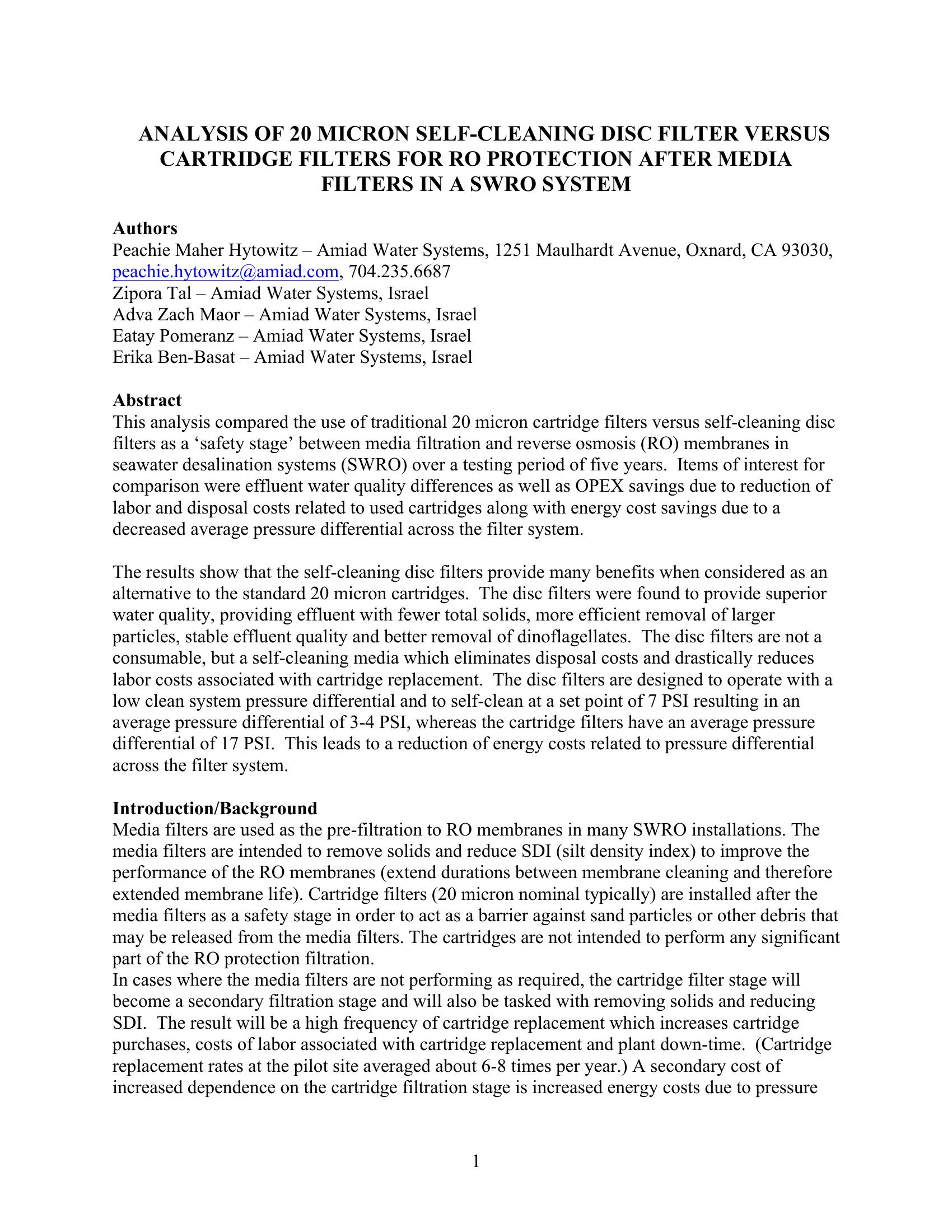 Analysis of 20 Micron Self-Cleaning Disc Filter Versus Cartridge Filters for RO Protection After Media Filters in a SWRO System