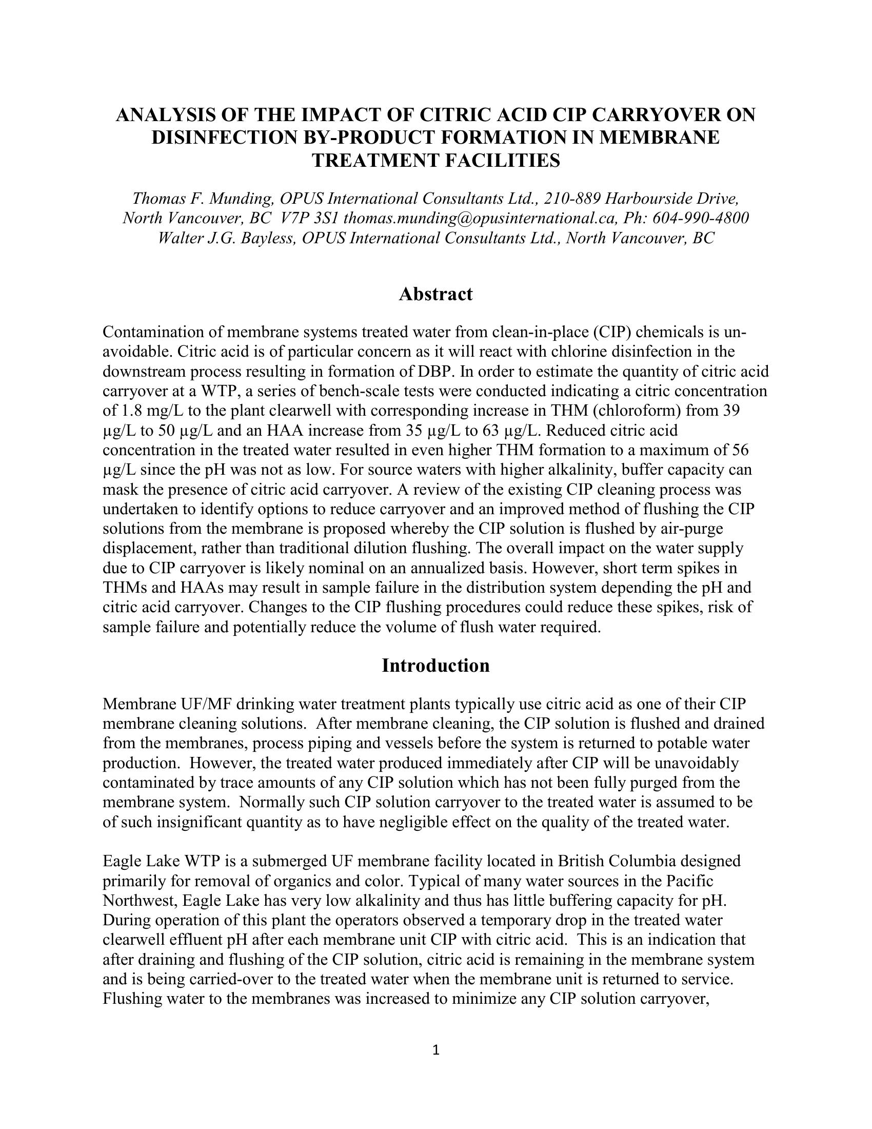 Contamination of membrane systems treated water from clean-in-place (CIP) chemicals is un-avoidable. Citric acid is of particular concern as it will react with chlorine disinfection in the downstream process resulting in formation of DBP. In order to estimate the quantity of citric acid carryover at a WTP, a series of bench-scale tests were conducted indicating a citric concentration of 1.8 mg/L to the plant clearwell with corresponding increase in THM (chloroform) from 39 g/L to 50 g/L and an HAA increase from 35 g/L to 63 g/L. Reduced citric acid concentration in the treated water resulted in even higher THM formation to a maximum of 56 g/L since the pH was not as low. For source waters with higher alkalinity, buffer capacity can mask the presence of citric acid carryover. A review of the existing CIP cleaning process was undertaken to identify options to reduce carryover and an improved method of flushing the CIP solutions from the membrane is proposed whereby the CIP solution is flushed by air-purge displacement, rather than traditional dilution flushing. The overall impact on the water supply due to CIP carryover is likely nominal on an annualized basis. However, short term spikes in THMs and HAAs may result in sample failure in the distribution system depending the pH and citric acid carryover. Changes to the CIP flushing procedures could reduce these spikes, risk of sample failure and potentially reduce the volume of flush water required.