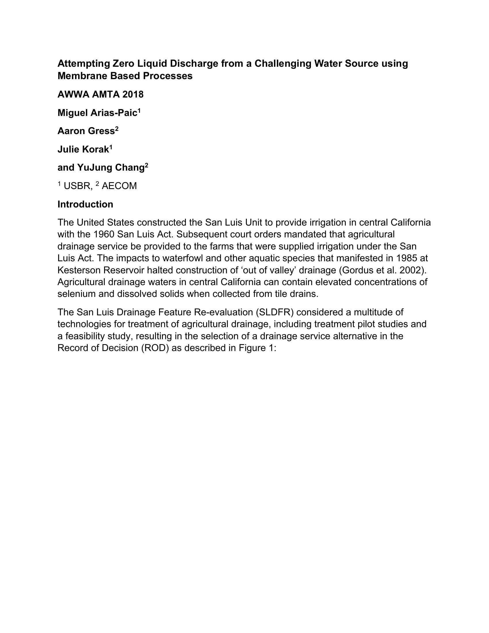 The United States constructed the San Luis Unit to provide irrigation in central California with the 1960 San Luis Act. Subsequent court orders mandated that agricultural drainage service be provided to the farms that were supplied irrigation under the San Luis Act. The impacts to waterfowl and other aquatic species that manifested in 1985 at Kesterson Reservoir halted construction of “out-of-valley” drainage. Reclamation began construction of the San Luis Demonstration Plant (SLDP) to determine the best “in-valley” solution to agricultural drainage, with the water district associated with the SLDP preferring implementation of alternative technologies capable of near zero liquid discharge.