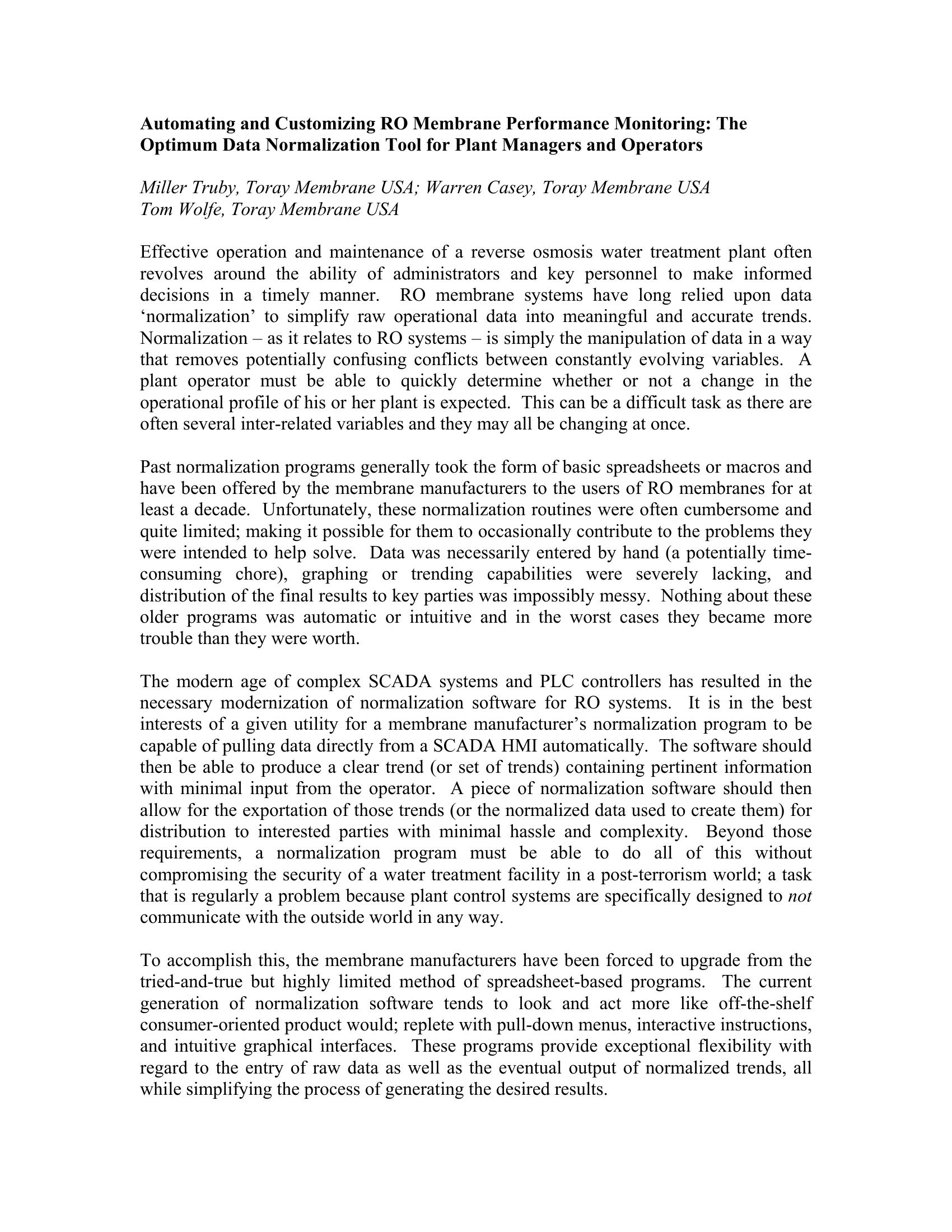 Spreadsheet based data analysis tools have been provided by RO membrane manufacturers for years. These tools have been cumbersome and have limited power. Because off the advanced computer based SCADA systems we have today and stand alone software has been developed for real time data evaluation.