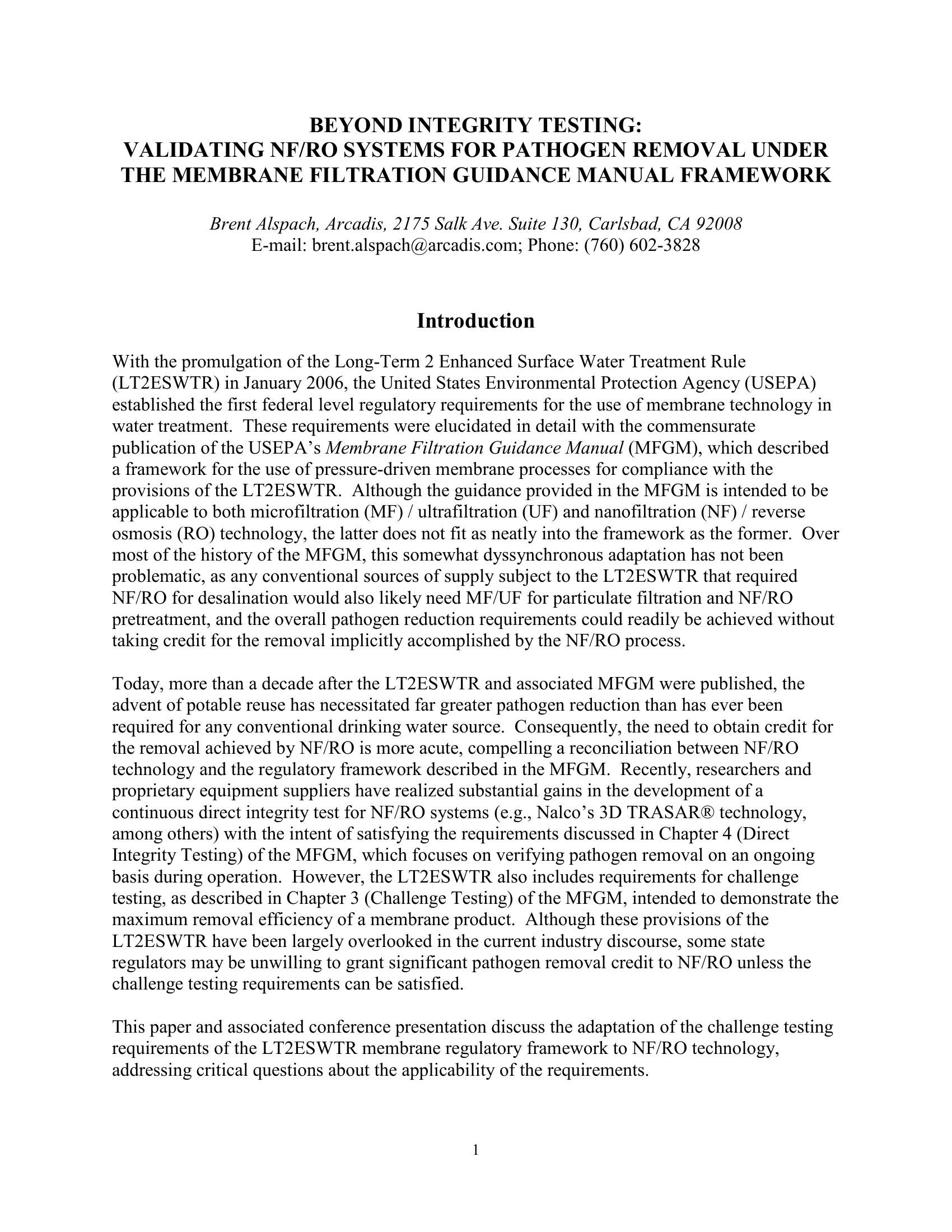 Although significant progress has been made toward the development of continuous direct integrity test methods for NF/RO systems, the current industry discourse has largely overlooked the challenge testing requirements described in the Membrane Filtration Guidance Manual (MFGM). However, some state regulators may be unwilling to grant significant pathogen removal credit to NF/RO unless these challenge testing requirements can be satisfied. This presentation discusses the adaptation of the challenge testing requirements of the LT2ESWTR membrane regulatory framework to NF/RO, addressing critical questions and a potential path forward for reconciling the technology to the regulations for compliance.