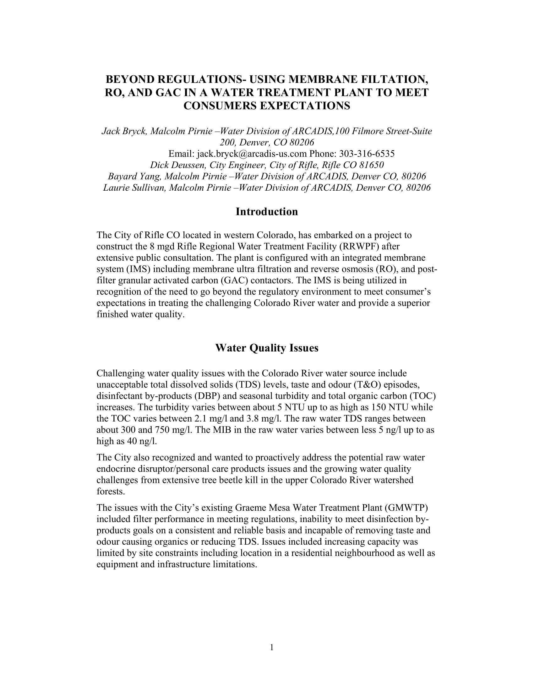 Beyond Regulations-Using Membrane Filtration, RO and GAC in a Water Treatment Plant to Meet Consumers Expectations