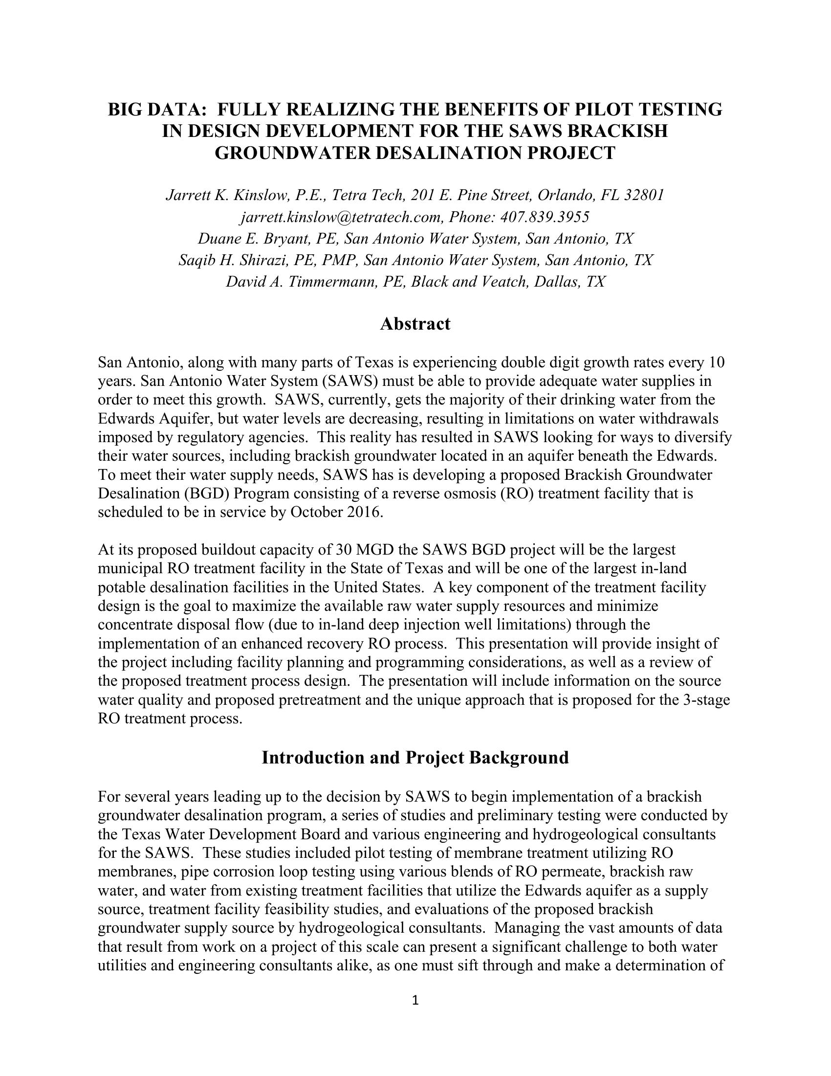 Big Data: Fully Realizing the Benefits of Pilot Testing in Design Development for the SAWS Brackish Groundwater Desalination Project