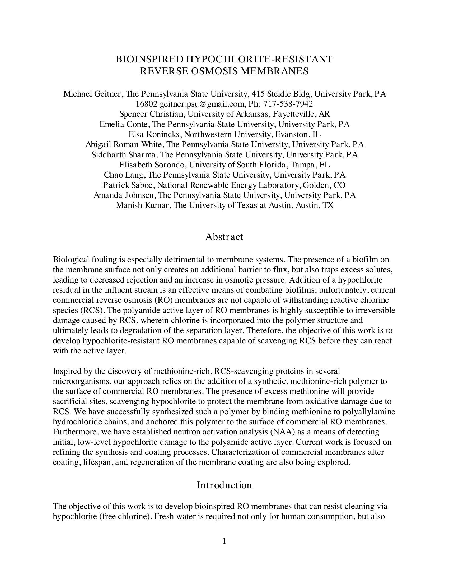 | Keywords | Hypochlorite-Resistance, Reverse Osmosis, Bioinspired |