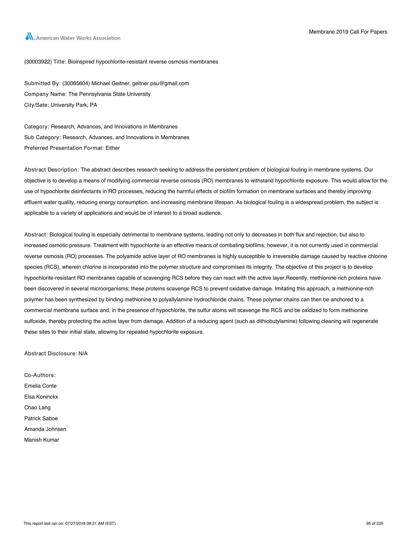 The abstract describes research seeking to address the persistent problem of biological fouling in membrane systems. Our objective is to develop a means of modifying commercial reverse osmosis (RO) membranes to withstand hypochlorite exposure. This would allow for the use of hypochlorite disinfectants in RO processes, reducing the harmful effects of biofilm formation on membrane surfaces and thereby improving effluent water quality, reducing energy consumption, and increasing membrane lifespan. As biological fouling is a widespread problem, the subject is applicable to a variety of applications and would be of interest to a broad audience.