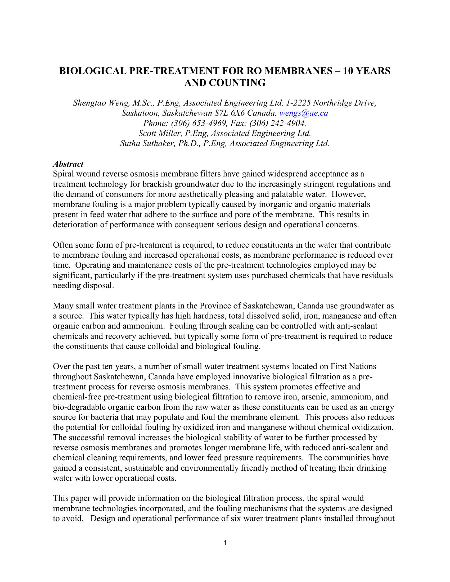 The intent of the paper is to provide an overall picture demonstrating the success of a biological filtration process, over the past eleven years, as a proven application for pretreating poor quality groundwater in small system membrane water treatment plants. This information will provide designers and owners with real project examples summarizing the performance of multiple reverse osmosis (RO) plants ranging in age from 1 to 11 years, all utilizing biological filtration for the pretreatment of water prior to the membrane system.