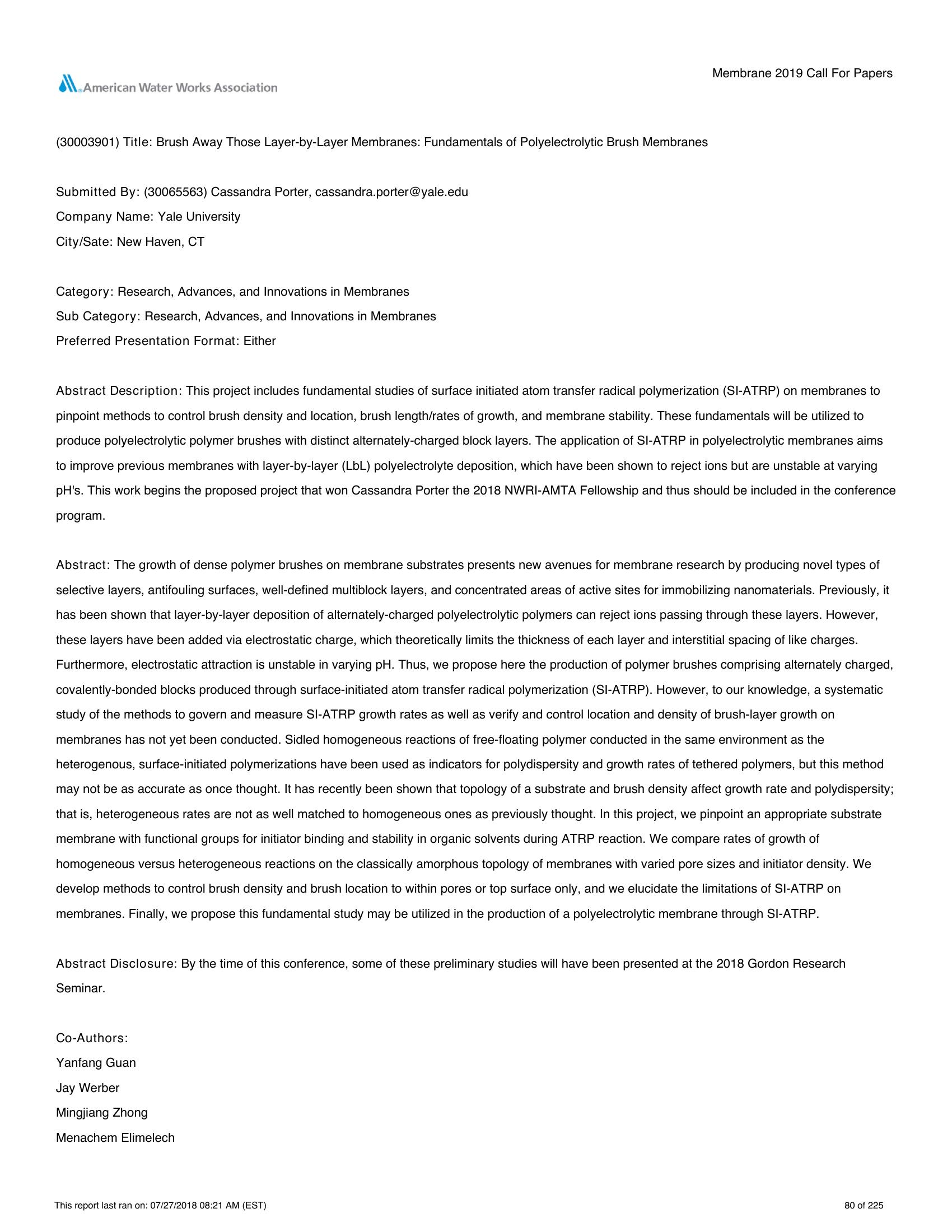 This project includes fundamental studies of surface initiated atom transfer radical polymerization (SI-ATRP) on membranes to pinpoint methods to control brush density and location, brush length/rates of growth, and membrane stability. These fundamentals will be utilized to produce polyelectrolytic polymer brushes with distinct alternately-charged block layers. The application of SI-ATRP in polyelectrolytic membranes aims to improve previous membranes with layer-by-layer (LbL) polyelectrolyte deposition, which have been shown to reject ions but are unstable at varying pH’s. This work begins the proposed project that won Cassandra Porter the 2018 NWRI-AMTA Fellowship and thus should be included in the conference program.