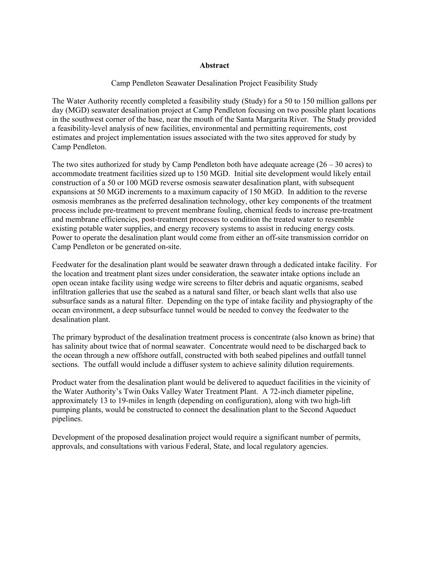The San Diego County Water Authority has performed a feasiblity analysis for locating a 50 to 150 MGD desalination facility at Camp Pendleton. Two sites were evaluated for intake design, environmental impacts, permitting requirements, transmission route alignment and cost. The desalination facility is under consideration so that the Agency can reduce its dependence on imported water (State Water Project and Colorado River water)and diversity its water supply portfolio.
