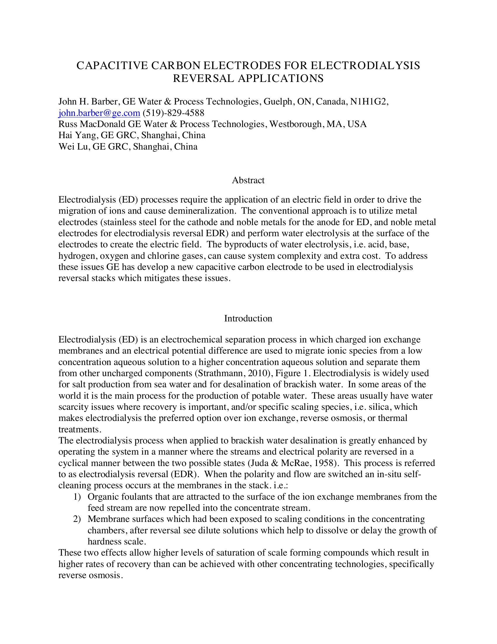 Capacitive Carbon Electrodes for Electrodialysis Reversal Applications