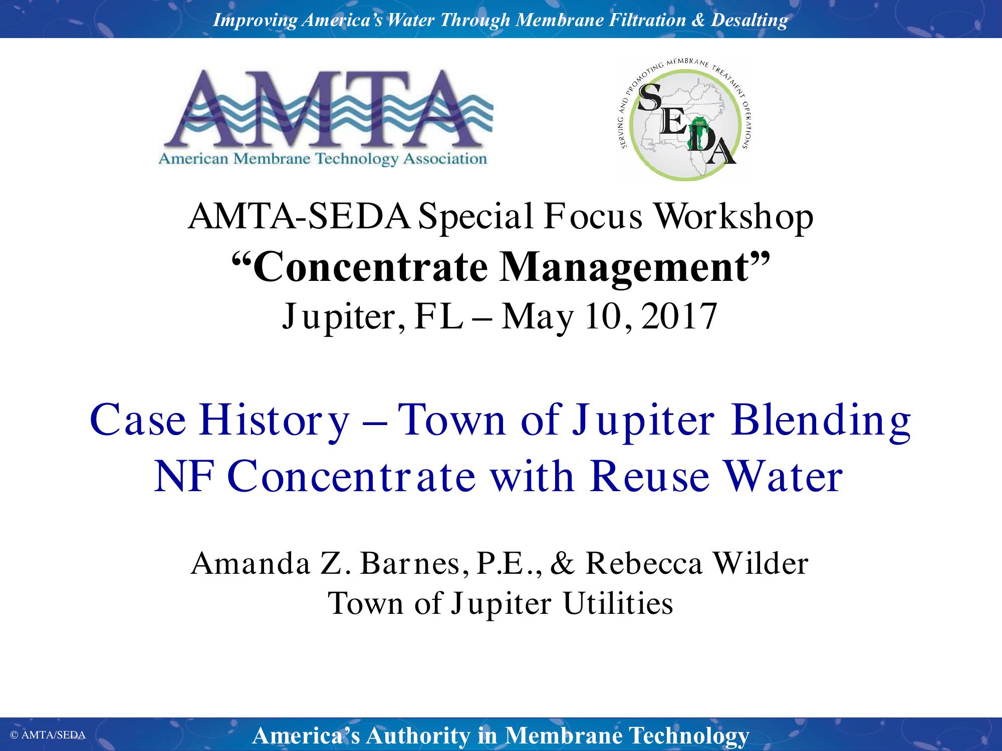 Reverse osmosis (RO) and nanofiltration (NF) membrane processes represent superior treatment technologies as they effectively reject unwanted contaminants producing high quality permeate, which is capable of meeting increasingly stringent drinking water regulations. For this reason, municipal drinking water purveyors are integrating membrane technologies into their treatment portfolio often replacing aging, conventional processes. A major concern with the use of RO and NF is the generation of a by-product stream called concentrate. Disposal of membrane concentrate is highly regulated by multiple Federal and State agencies, and can often be one of the most challenging and costly components in the design, permitting and construction of a membrane process. In 2004, the Town of Jupiter Utilities (Town) began planning for the replacement of its aging lime softening process, which included pilot testing and design of a 14.5 MGD NF Water Facility. Pilot testing demonstrated the feasibility of the membrane process, however, the Town had to address the need for disposal of the produced concentrate. The proposed facility would treat the Town?s fresh, groundwater supply, and produced concentrate would have lower TDS concentrations than what is typically seen with RO applications. Thus, it was proposed that the NF concentrate could be disposed by blending with treated effluent from the nearby wastewater treatment plant, and beneficially reused as reclaimed water. This innovative approach would increase reuse supplies for landscape irrigation and alleviate the need for additional groundwater resources often used to meet irrigation demand. This presentation will provide an overview of the Town?s NF facility, which was completed in 2010, describe the regulatory hurdles that were addressed to successfully permit the concept, as well as the construction and costs associated with this unique concentrate disposal option.