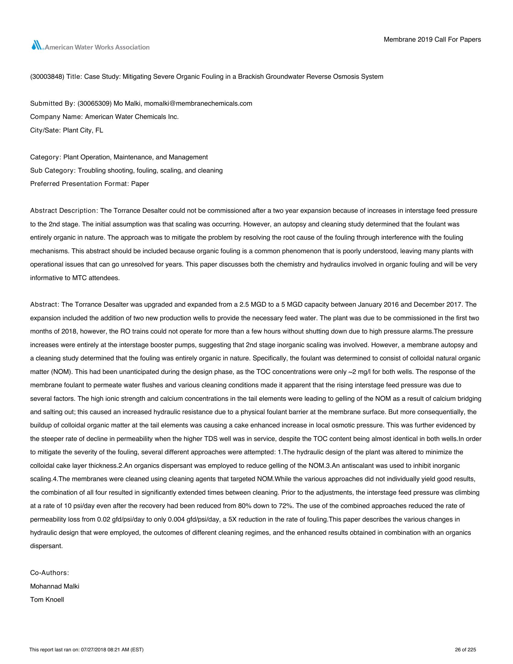 The Torrance Desalter could not be commissioned after a two year expansion because of increases in interstage feed pressure to the 2nd stage. The initial assumption was that scaling was occurring. However, an autopsy and cleaning study determined that the foulant was entirely organic in nature. The approach was to mitigate the problem by resolving the root cause of the fouling through interference with the fouling mechanisms. This abstract should be included because organic fouling is a common phenomenon that is poorly understood, leaving many plants with operational issues that can go unresolved for years. This paper discusses both the chemistry and hydraulics involved in organic fouling and will be very informative to MTC attendees.