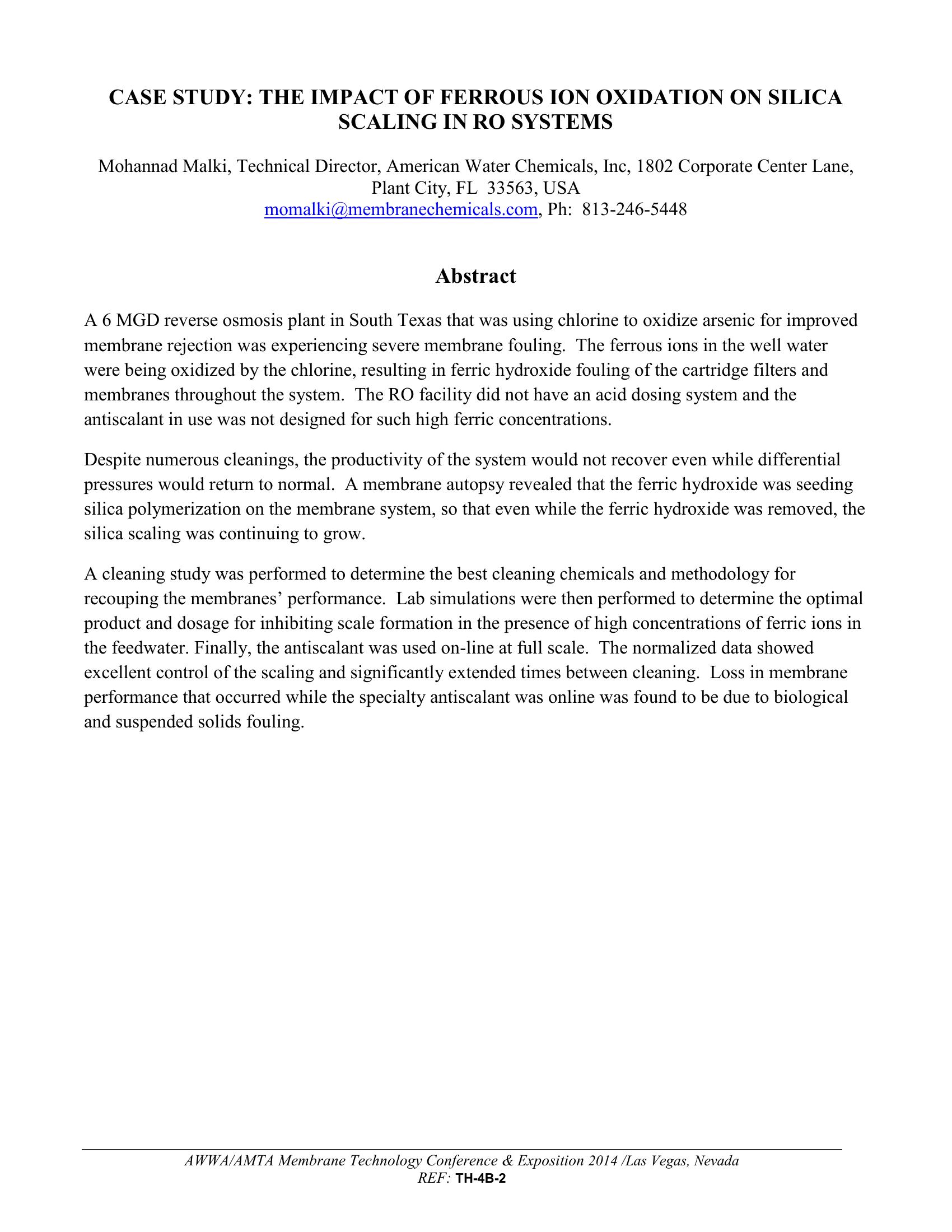 | Keywords | Ferrous Ion Oxidation, Silica Scaling, Reverse Osmosis (RO), CIP |