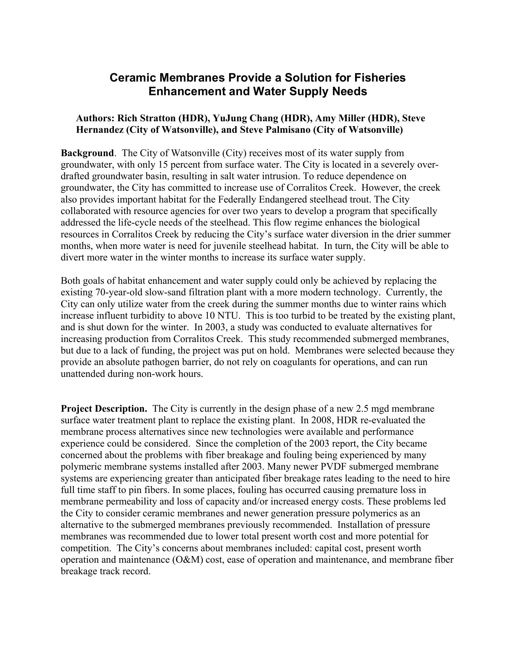 Ceramic Membranes Provide a Solution for Fisheries Enhancement and Water Supply Needs