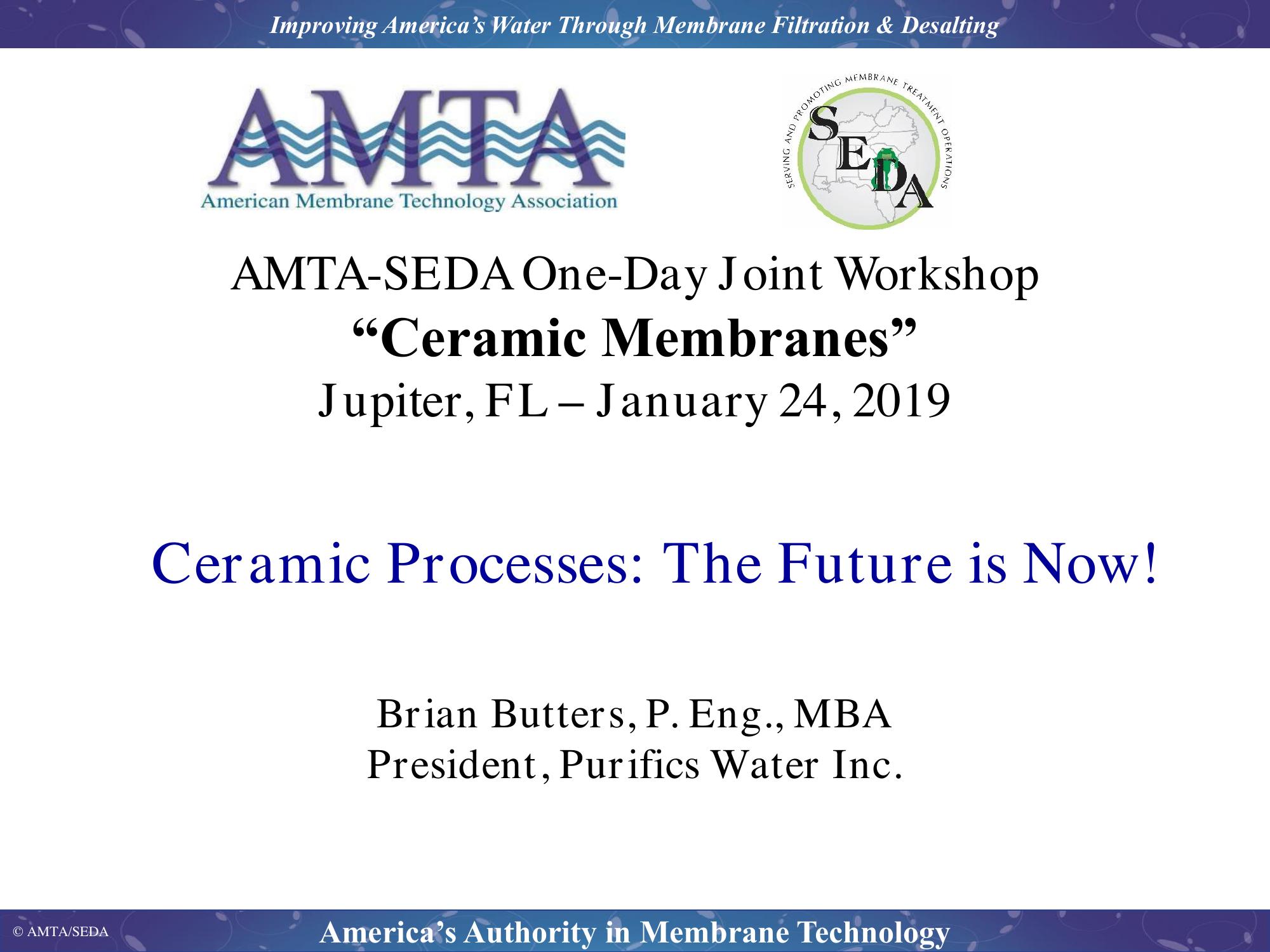 The presentation will cover four topics. First, the author will discuss the features and basic differences between polymeric and ceramic membranes. The second topic will be a brief history of ceramic membranes, tracing the history from the 1st generation to the current (i.e., 5th) generation membranes that were developed and are produced and marketed by Purifics. Third, the author will discuss Purifics three patented technologies, all of which feature ceramic membranes. The three technologies are ceramic ultrafiltration (CUF?), photocatalytic oxidation (Photo-Cat?), and dewatering recovery system (DeWRS). Fourth and finally, several case studies will be presented, including applications for drinking water ZLD, stormwater reuse, and remediation of groundwater in Florida.