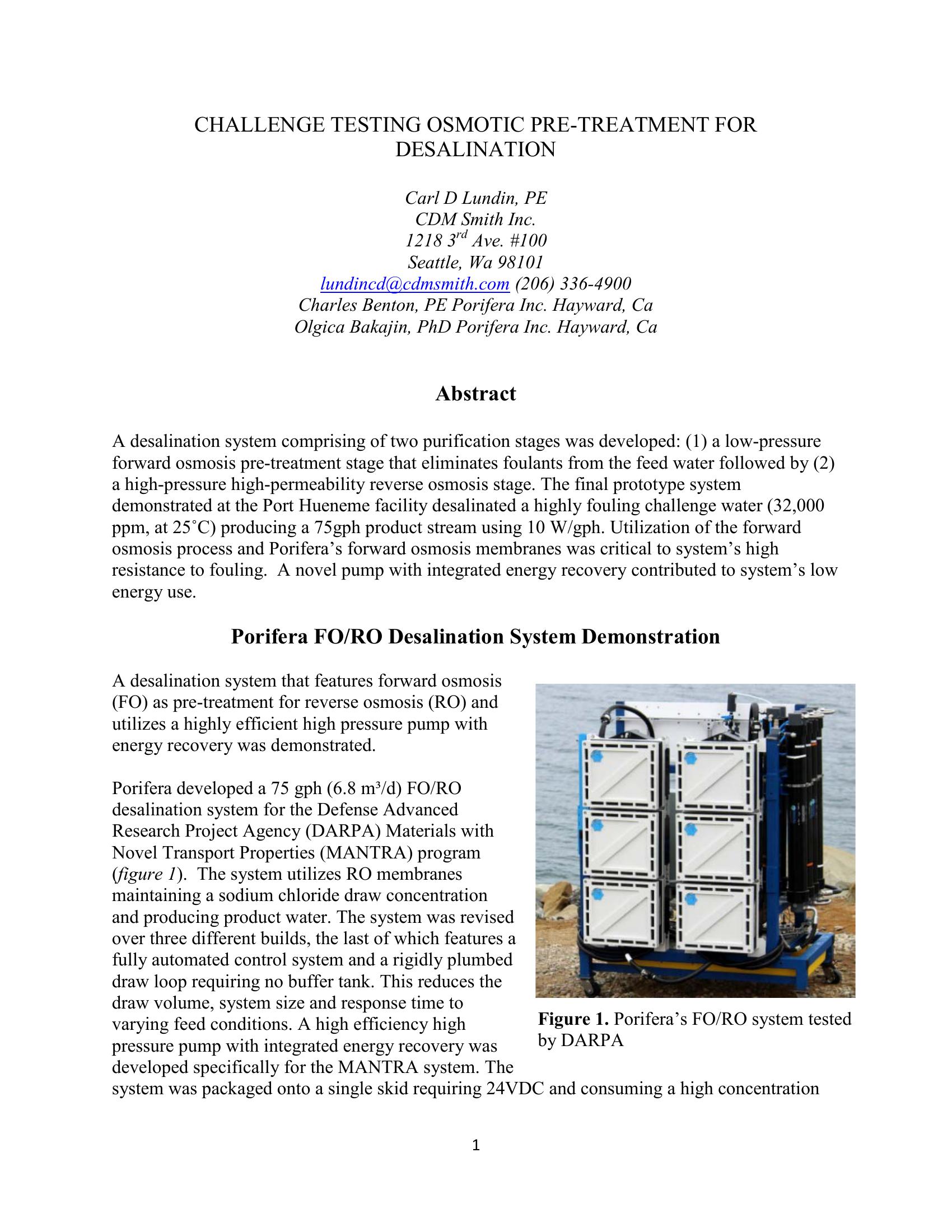 A desalination system comprising of two purification stages was developed: (1) a low-pressure forward osmosis pre-treatment stage that eliminates foulants from the feed water followed by (2) a high-pressure high-permeability reverse osmosis stage. The final prototype system demonstrated at the Port Hueneme facility desalinated a highly fouling challenge water (32,000 ppm, at 25?C) producing a 75gph product stream using 10 W/gph. Utilization of the forward osmosis process and Porifera?s forward osmosis membranes was critical to system?s high resistance to fouling. A novel pump with integrated energy recovery contributed to system?s low energy use.