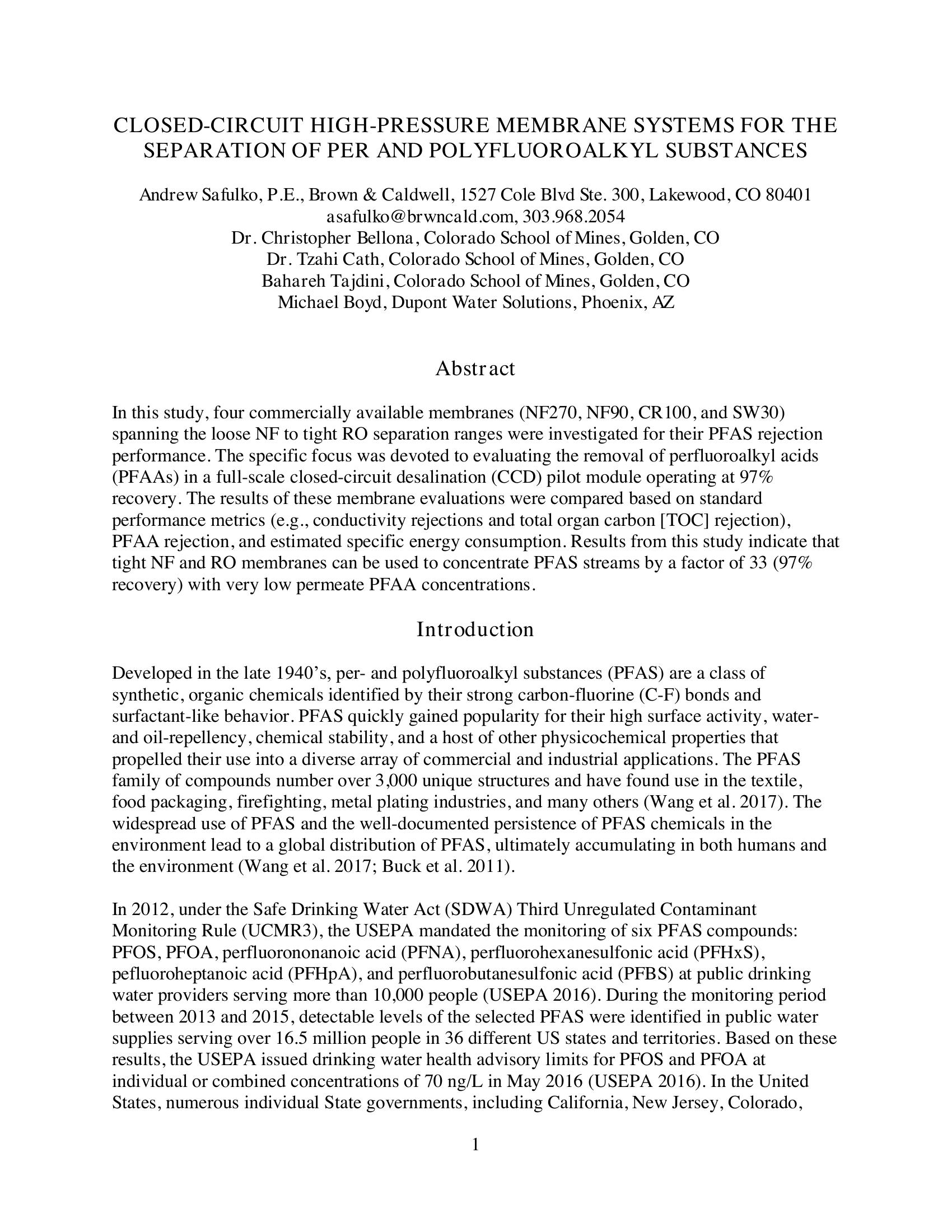 In this study, four commercially available membranes (NF270, NF90, CR100, and SW30) spanning the loose NF to tight RO separation ranges were investigated for their PFAS rejection performance. The specific focus was devoted to evaluating the removal of perfluoroalkyl acids (PFAAs) in a full-scale closed-circuit desalination (CCD) pilot module operating at 97% recovery. The results of these membrane evaluations were compared based on standard performance metrics (e.g., conductivity rejections and total organ carbon [TOC] rejection), PFAA rejection, and estimated specific energy consumption. Results from this study indicate that tight NF and RO membranes can be used to concentrate PFAS streams by a factor of 33 (97% recovery) with very low permeate PFAA concentrations.