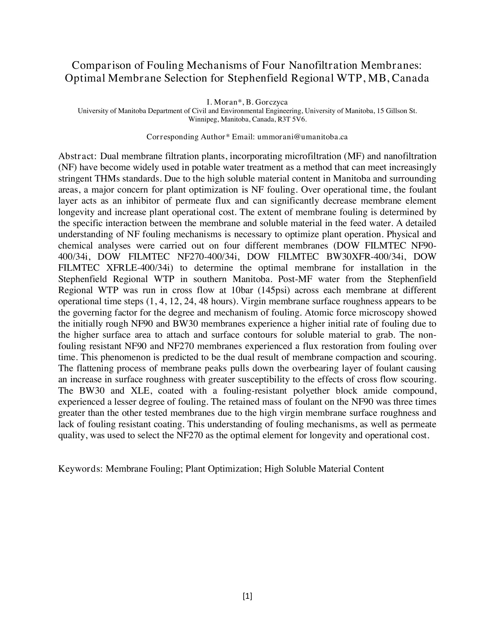 This paper compares the fouling mechanisms of four nanofiltration membranes following a microfiltration unit. Efforts to make the optimal membrane selection for Stephenfield Regional WTP, MB, Canada are presented.