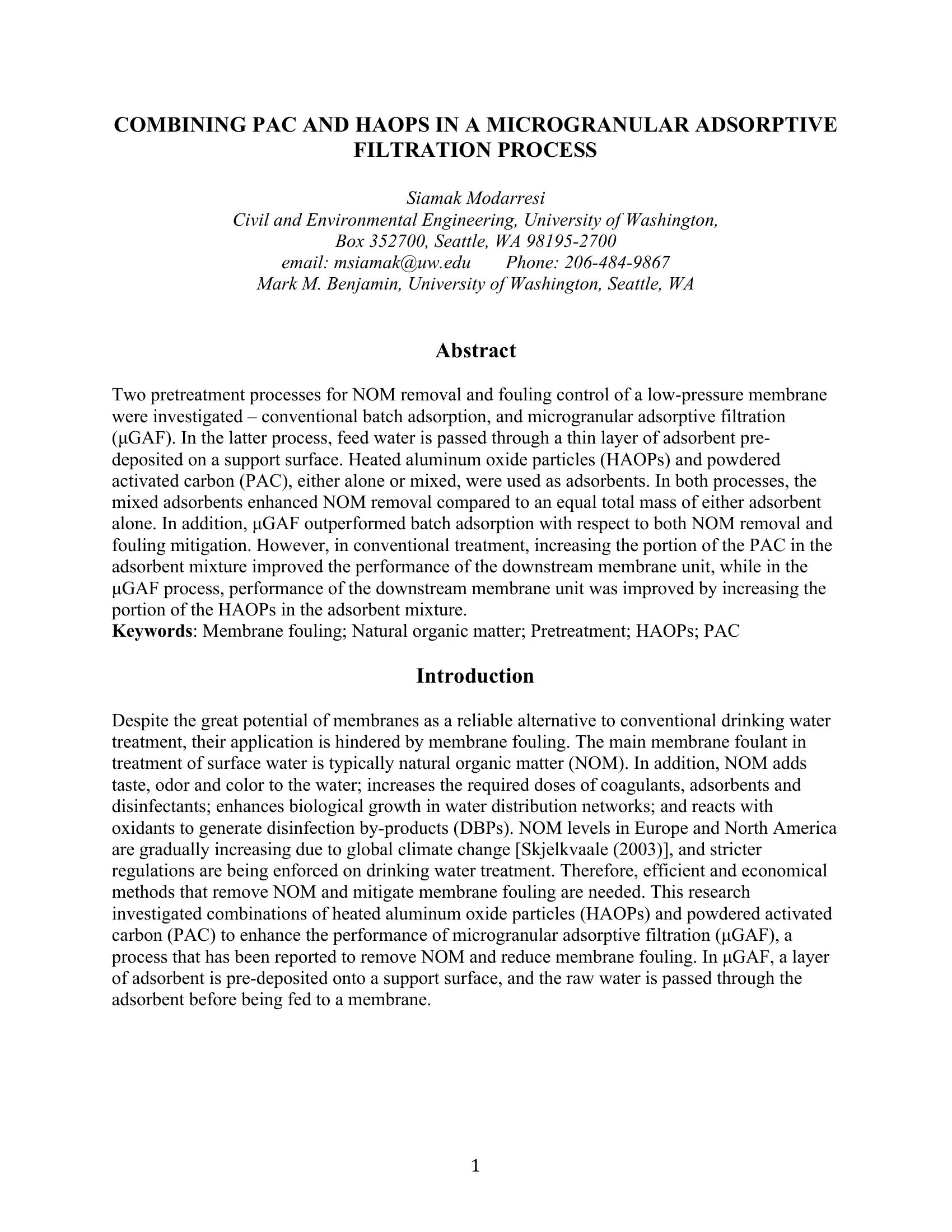 This paper presents and investigation into two pretreatment processes for Natural organic matter (NOM) removal and fouling control of a low-pressure membrane.. Heated aluminum oxide particles (HAOPs) and powdered activated carbon (PAC), either alone or mixed, were used as adsorbents. The mixed adsorbents enhanced NOM removal compared to an equal total mass of either adsorbent alone. In conventional treatment, increasing the portion of the PAC in the adsorbent mixture improved the performance of the downstream membrane unit, while in the ÊGAF process, performance of the downstream membrane unit was improved by increasing the portion of the HAOPs in the adsorbent mixture
