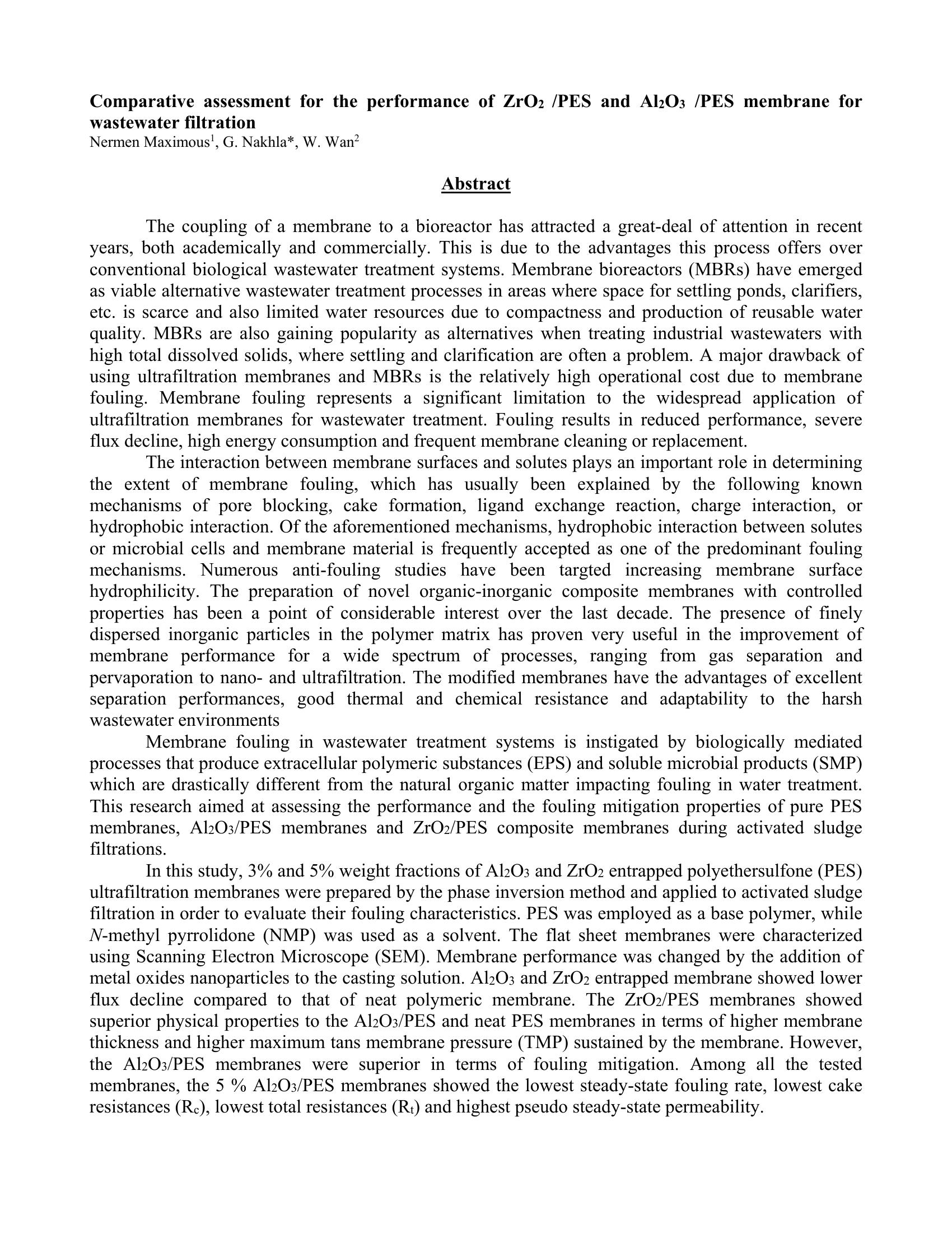 The preparation of novel organic-inorganic composite membranes with controlled properties has been a point of considerable interest over the last decade. In this study, 5% weight fractions of Al2O3 and ZrO2 entrapped polyethersulfone (PES) ultrafiltration membranes were prepared by the phase inversion method and applied to activated sludge filtration and to synthetic wastewater laden with heavy metals in order to evaluate their fouling characteristics and their metal removal efficiencies. The aim of this research was to compare the performance of 5 % by weight Al2O3/PES membranes and ZrO2/PES composite membranes and to the neat PES membranes during activated sludge filtration and heavy metals filtration. The major findings of this study are: 1. PES membrane characteristics and performance were enhanced by the addition of metal oxides particles to the casting solution, with increase in membrane steady-state permeabilities and decrease in membranes total and cake resistances 2. Of all the tested membranes, the Al2O3/PES membranes showed the lowest pseudo steady-state fouling rate, lowest cake and total residences and the highest pseudo steady-state permeabilities during sludge filtration. 3. Given that the metal removal efficiencies by the two tested membranes are comparable with the order of Pb > Cr > Cd for metal filtration, the ZrO2/PES membranes are superior in terms of membrane fouling and maintenance as they exhibited the lowest Rt (almost half that of the 0.05 Al2O3/PES membranes) and the highest pseudo steady-state permeability (yß) (twice that of the Al2O3/PES membranes).