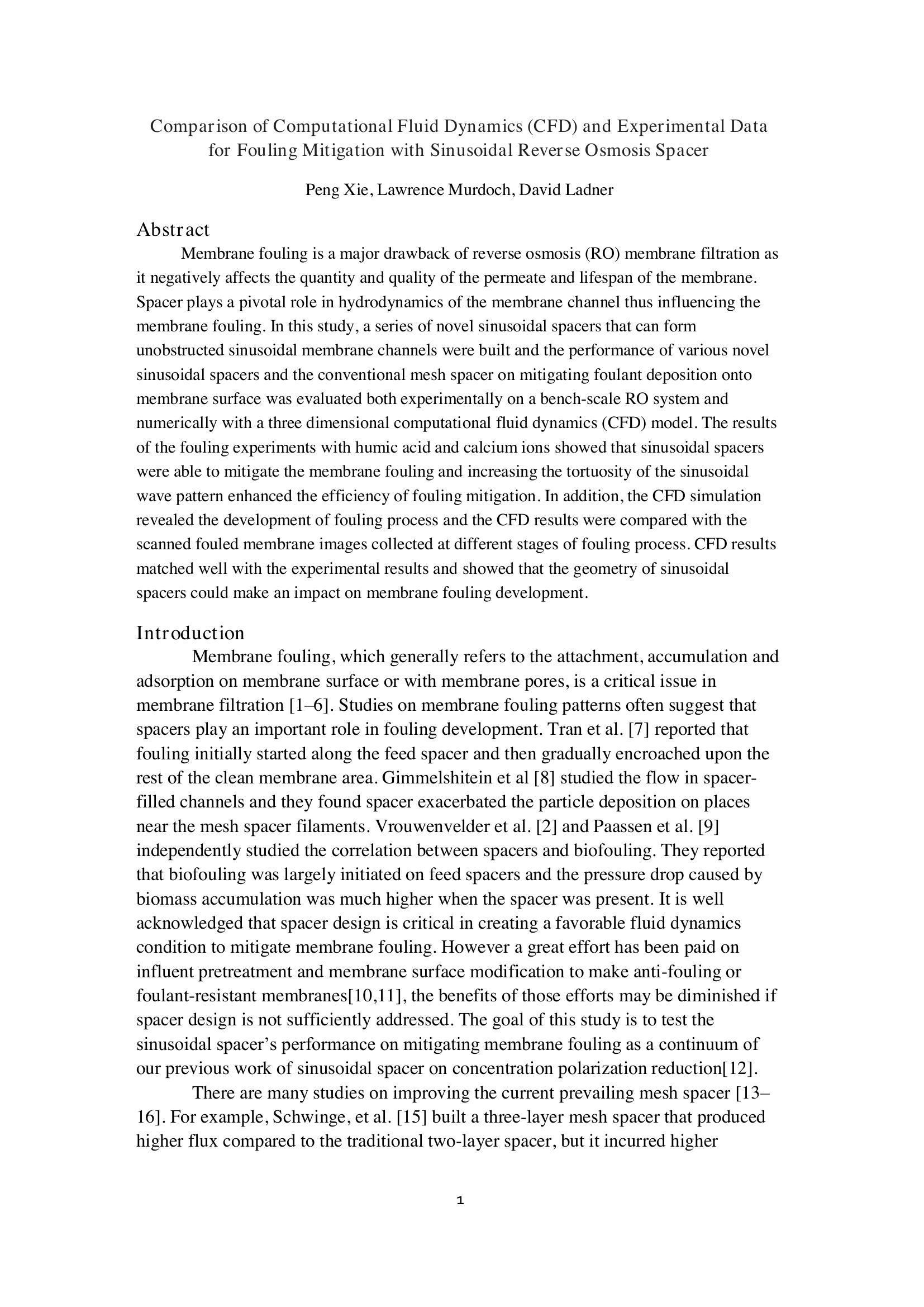 This paper describes work done on a series of novel sinusoidal spacers that can form unobstructed sinusoidal membrane channels and the performance of various novel sinusoidal spacers and the conventional mesh spacer on mitigating foulant deposition onto membrane surface. Data was evaluated both experimentally on a bench-scale RO system and numerically with a three dimensional computational fluid dynamics (CFD) model. The results of the fouling experiments with humic acid and calcium ions showed that sinusoidal spacers were able to mitigate the membrane fouling and increasing the tortuosity of the sinusoidal wave pattern enhanced the efficiency of fouling mitigation.