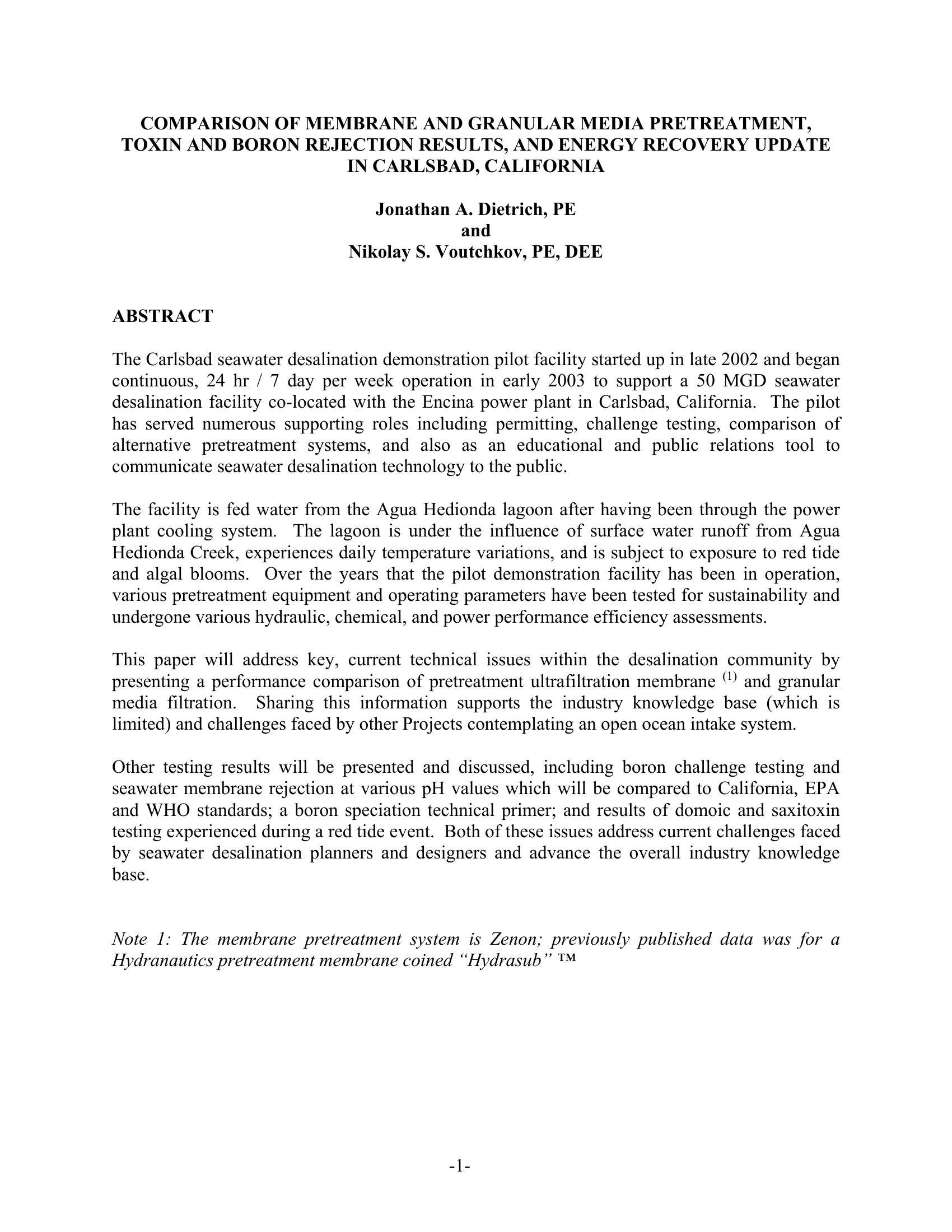 Comparison of Membrane and Granular Media Pretreatment, Toxin, and Boron Rejection Results, and Energy Recovery Update in Carlsbad, California
