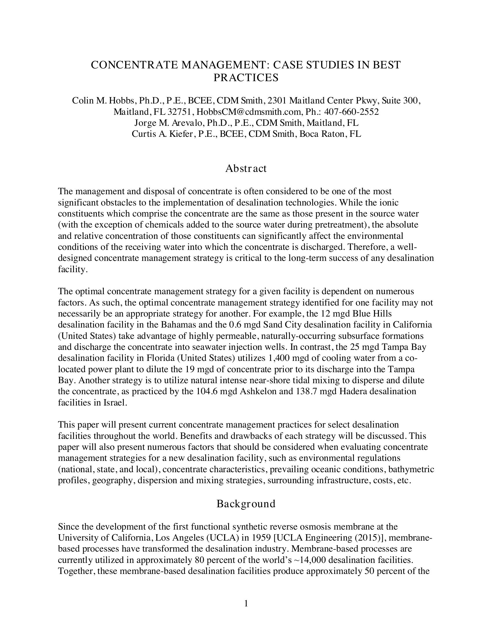 This paper will present current concentrate management practices for select desalination facilities throughout the world. Benefits and drawbacks of each strategy will be discussed. This paper will also present numerous factors that should be considered when evaluating concentrate management strategies for a new desalination facility