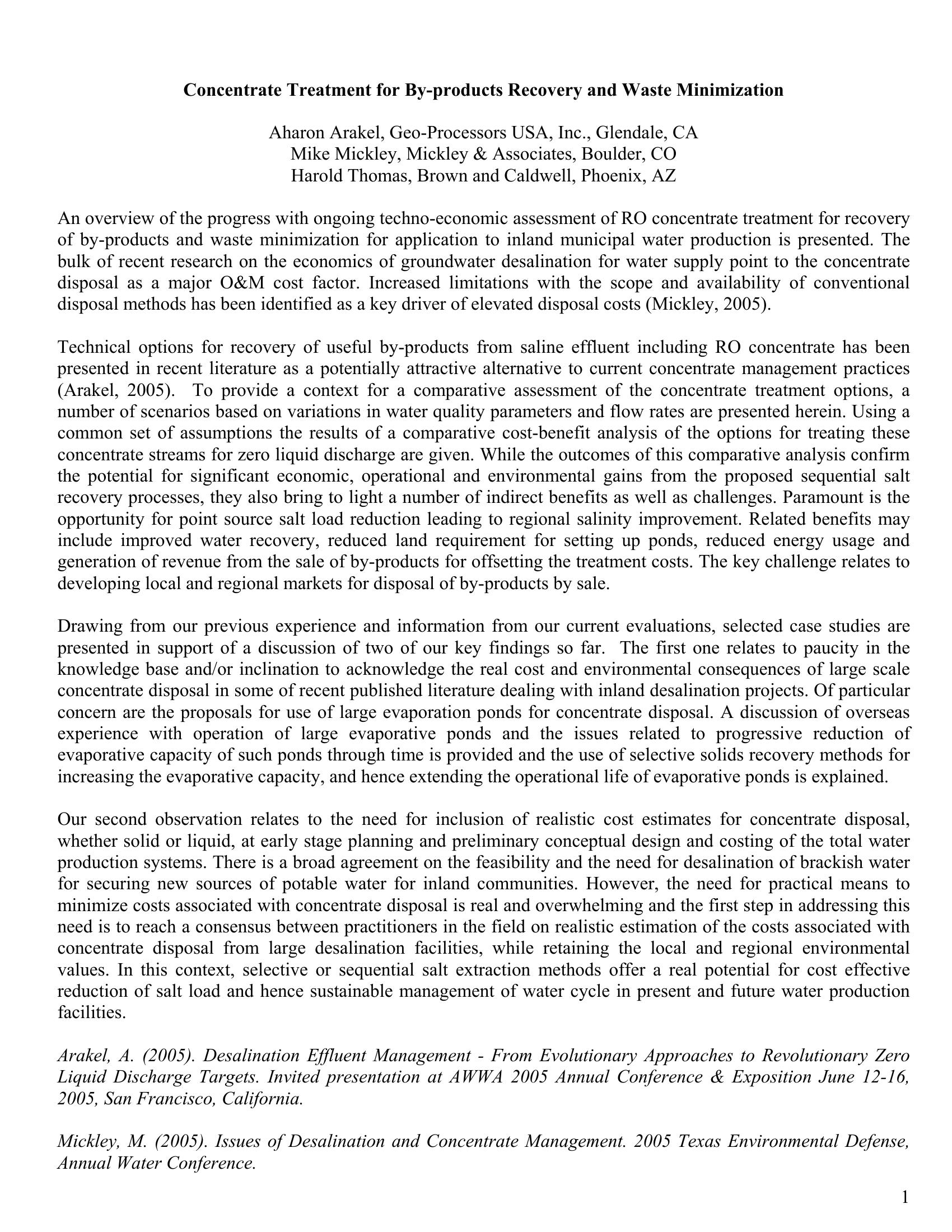 Concentrate Treatment for By-Products Recovery and Waste Minimalization