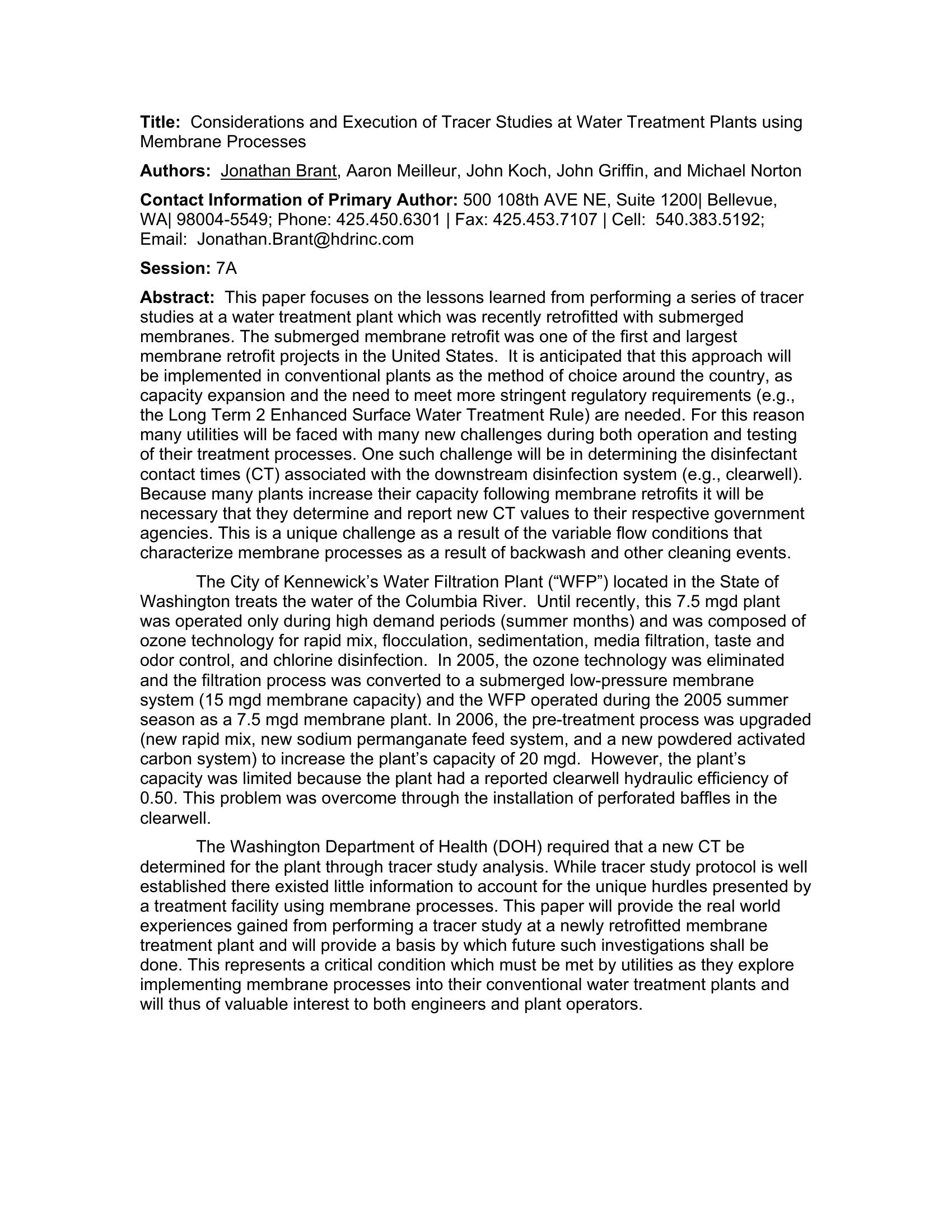 | Keywords | Kennewicks WTP, tracer studies, submerged membranes, microfiltration |
