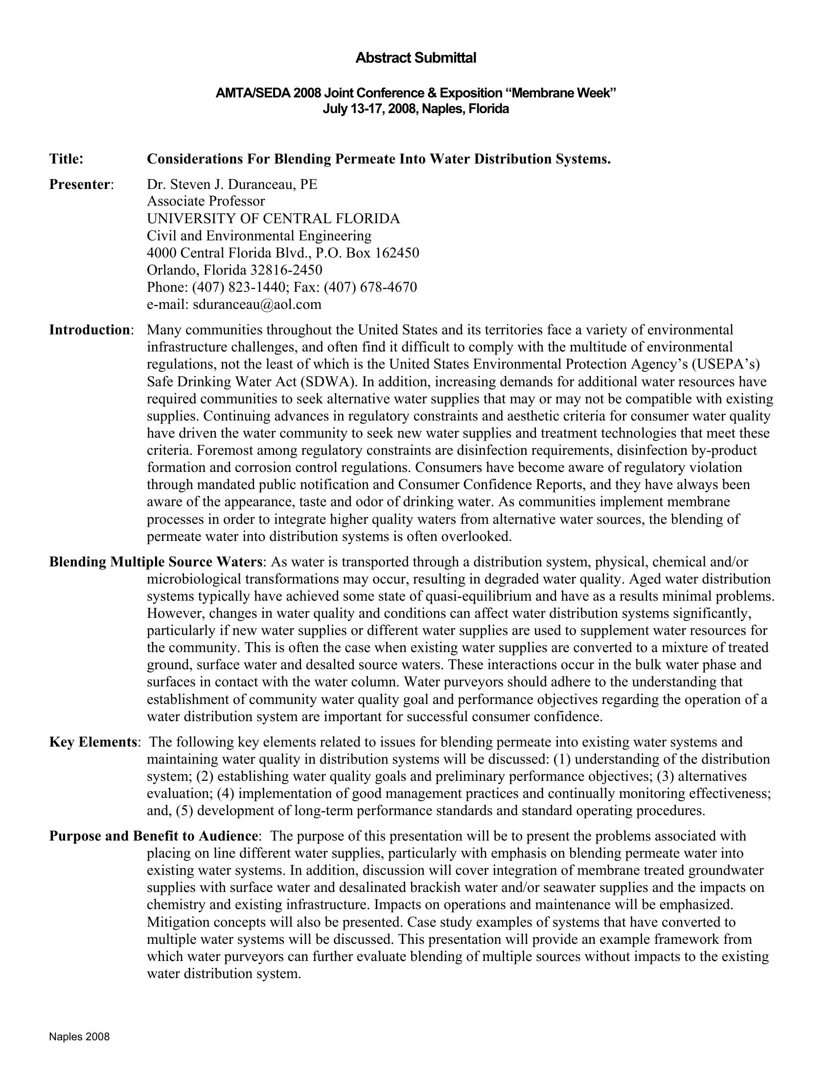 The purpose of this presentation was to present the problems associated with placing on line different water supplies; particularly with emphasis on blending permeate water into existing water systems. Also discussed is integration of membrane treated groundwater supplies with surface water and desalinated brackish water and/or seawater supplies and the impacts on chemistry and existing infrastructure. Mitigation concepts are also presented. Case study examples of systems that have converted to multiple water systems are discussed. This presentation provides an example framework from which water purveyors can further evaluate blending of multiple sources without impacts to an existing water distribution system