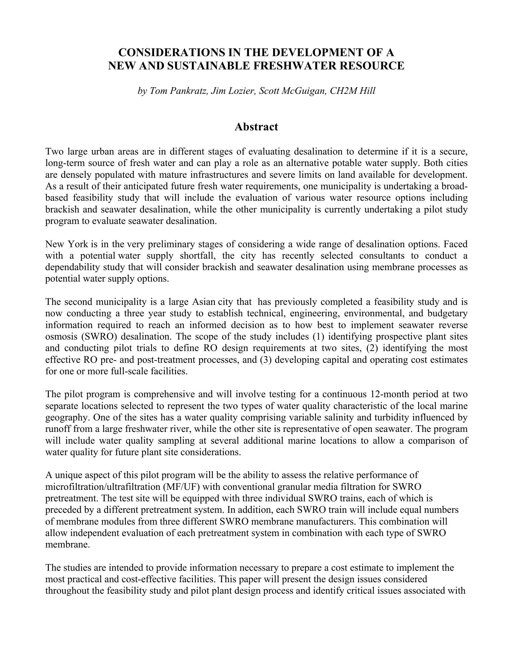 Considerations in the Development of a New and Sustainable Freshwater Resource