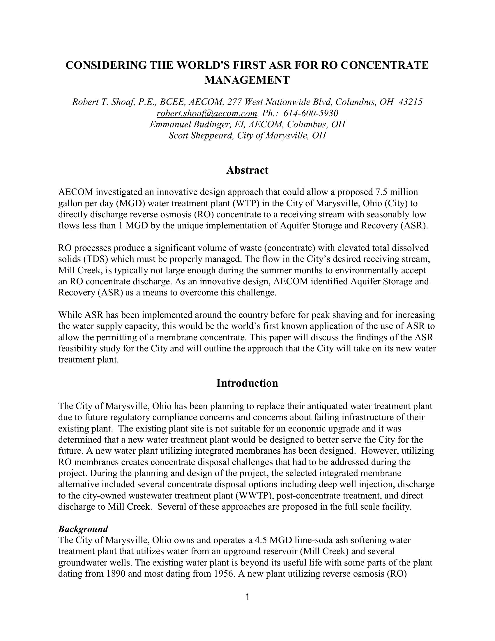 This paper will discuss the findings of the ASR feasibility study for the City of Marysville, OH and will outline the approach that the City will take on its new water treatment plant and concentrate management