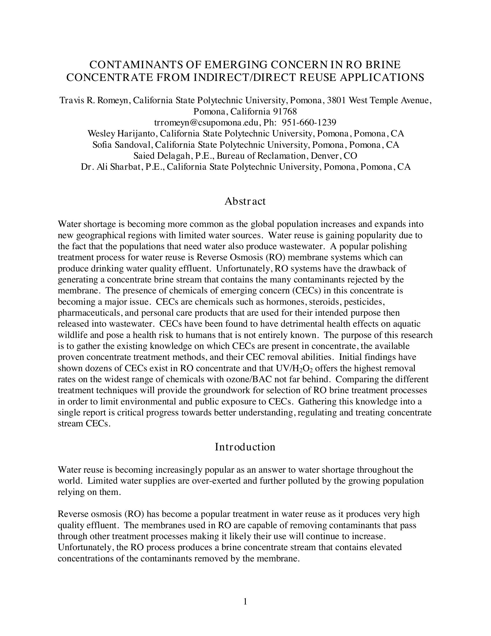 Contaminants of Emerging Concern in RO Brine Concentrate from Indirect/Direct Reuse Applications