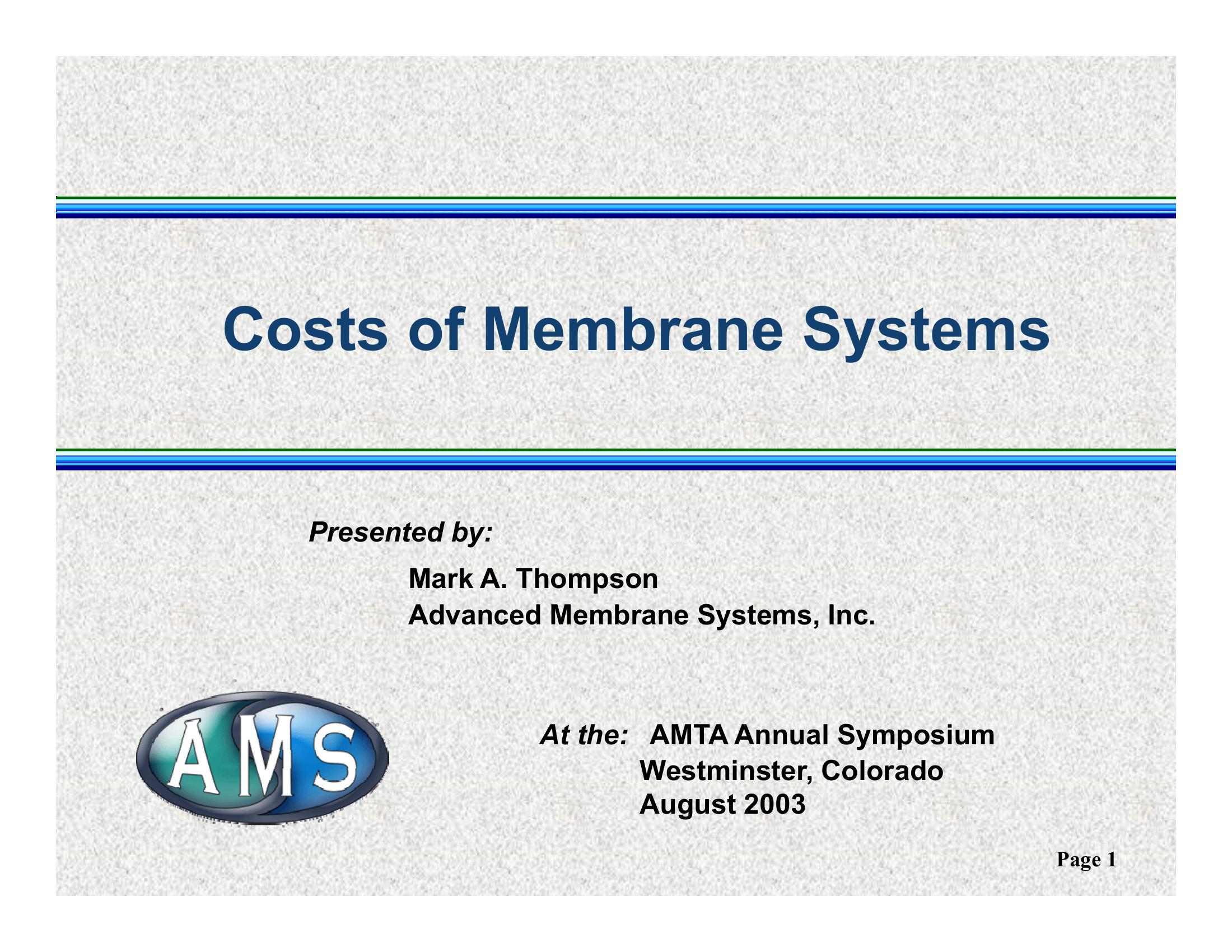Overview of the basic of membrane water treatment systems. The typical components of capital costs are defined while operating costs are also illustrated. The variables that contribute to these costs are noted with suggestions offered to minimize expense.