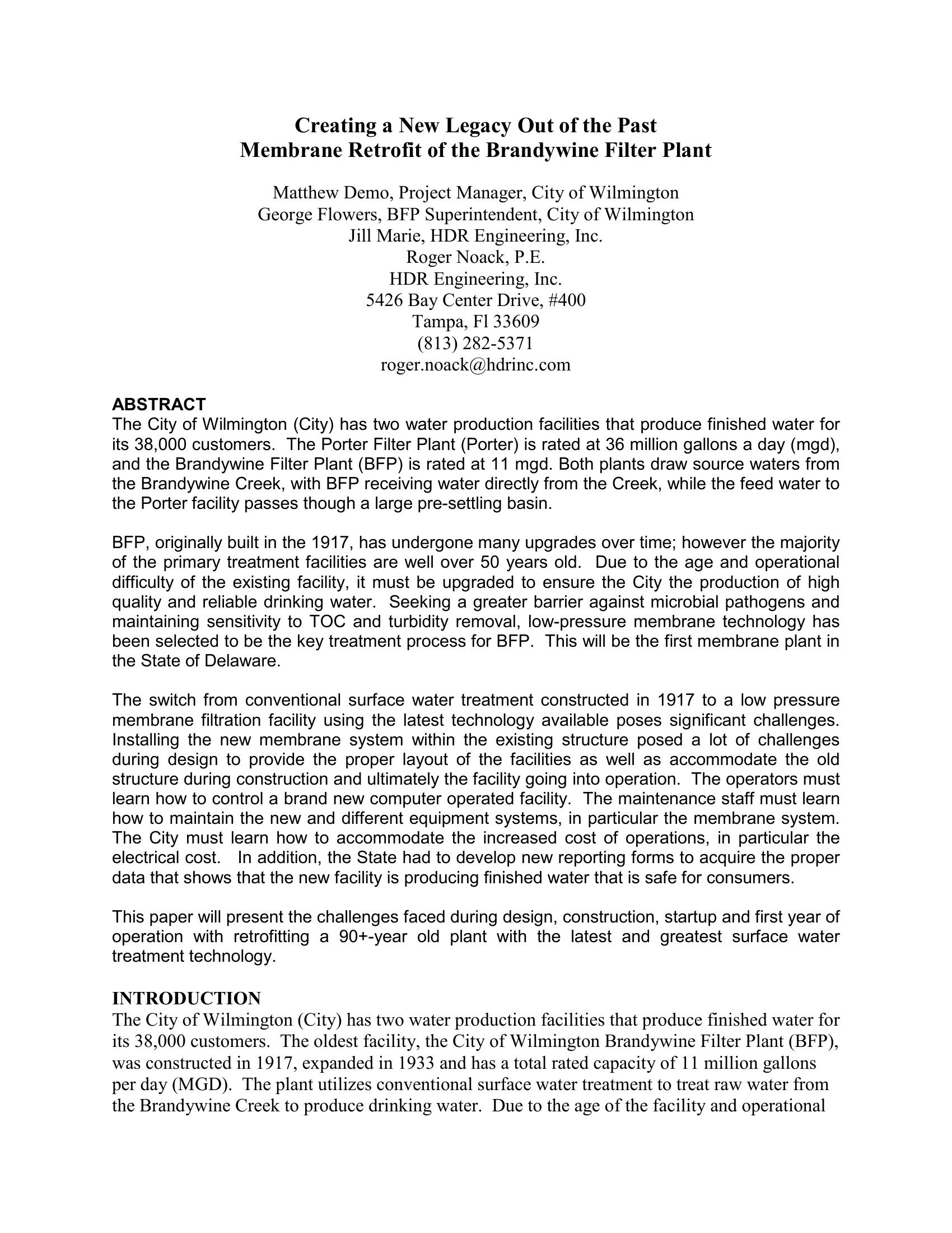Creating a New Legacy Out of the Past: Membrane Retrofit of the Brandywine Filtration Plant