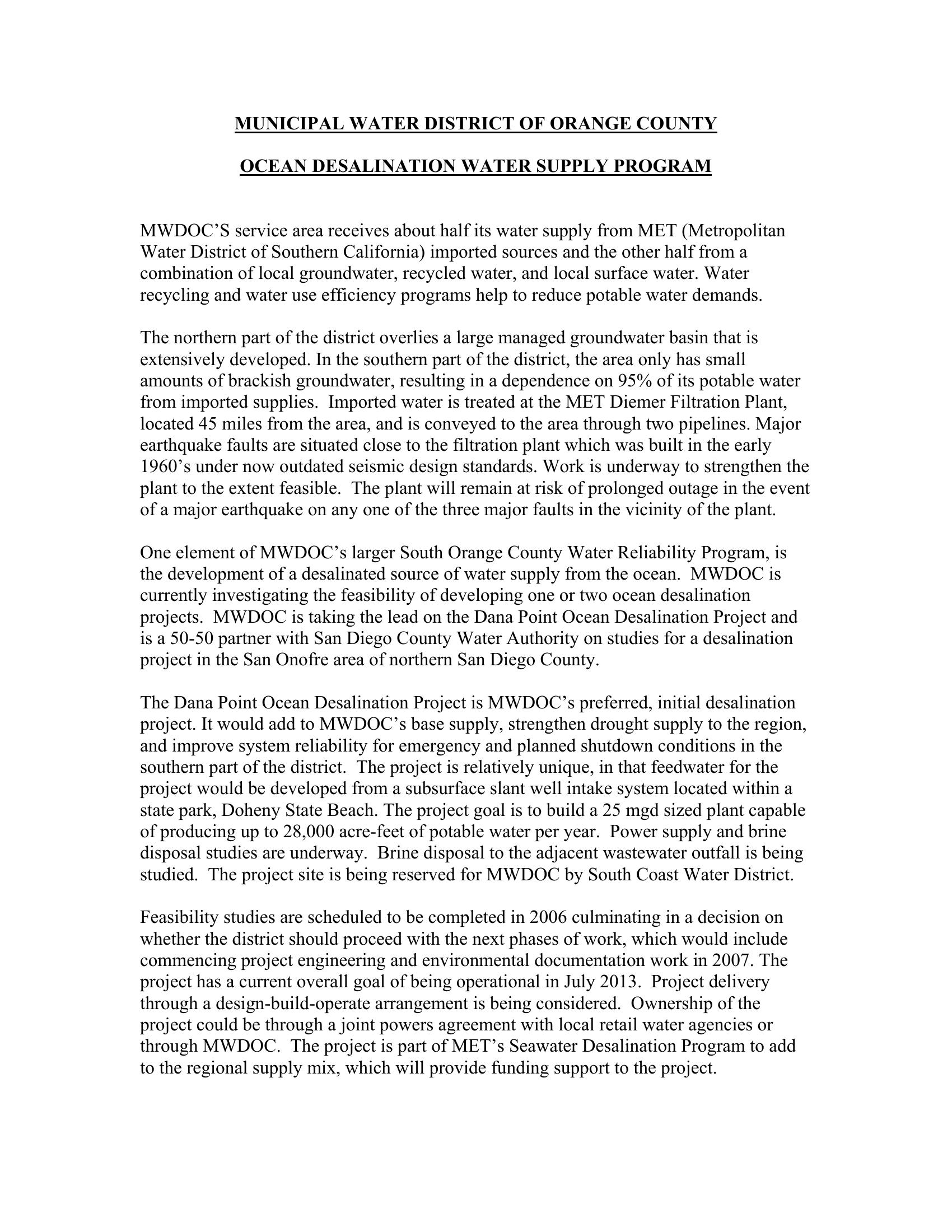 Dana Point Ocean Desalination Project Feasibility Investigation Update