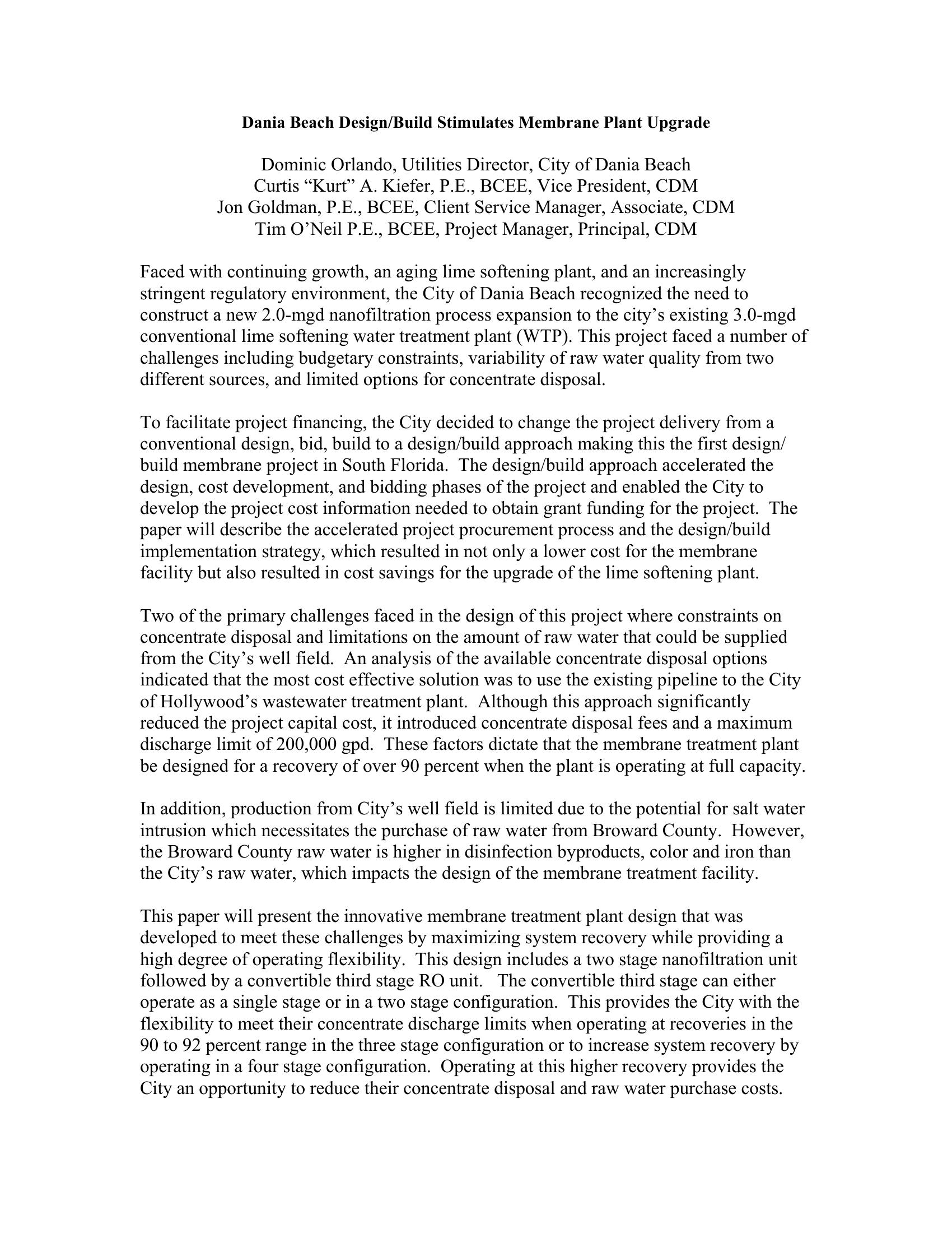 This paper will present the innovative membrane treatment plant design for the Dania Beach membrane plant that was developed to meet these challenges by maximizing system recovery while providing a developed to meet these challenges by maximizing system recovery while providing a high degree of operating flexibility. This design includes a two stage nanofiltration unit followed by a convertible third stage RO unit.